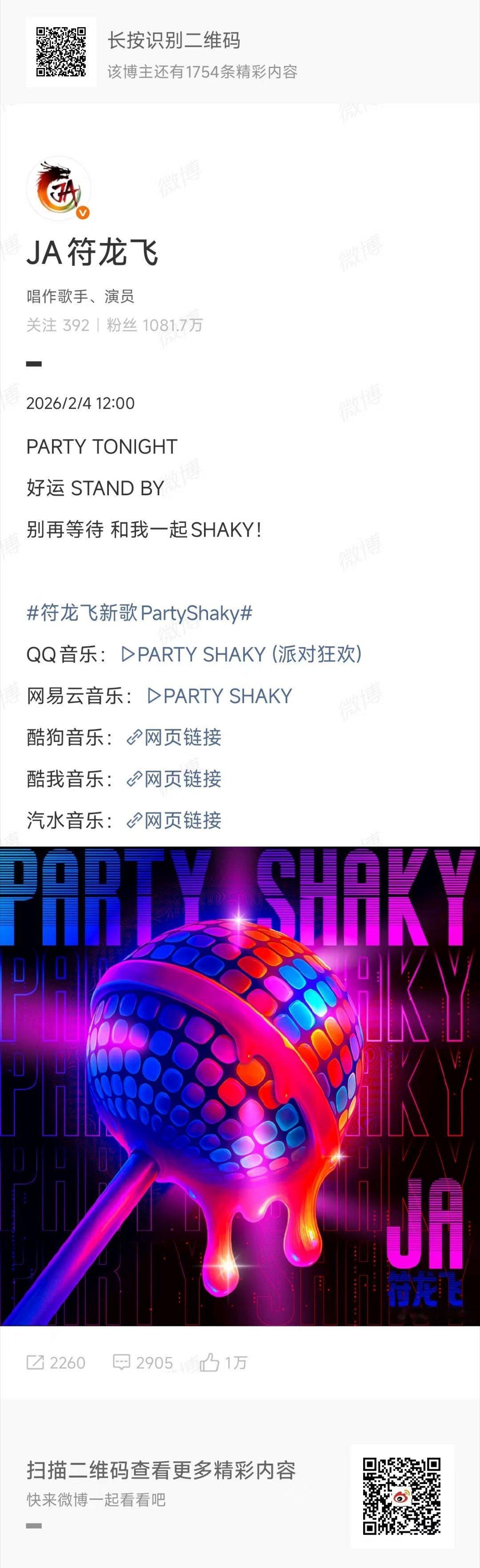 符龙飞新歌PartyShaky即刻进入快乐次元!《Party Shaky》音符跳跃间,构建出独属符龙飞的音乐结界。节奏明快如心跳共振,嗓音演绎直击耳膜