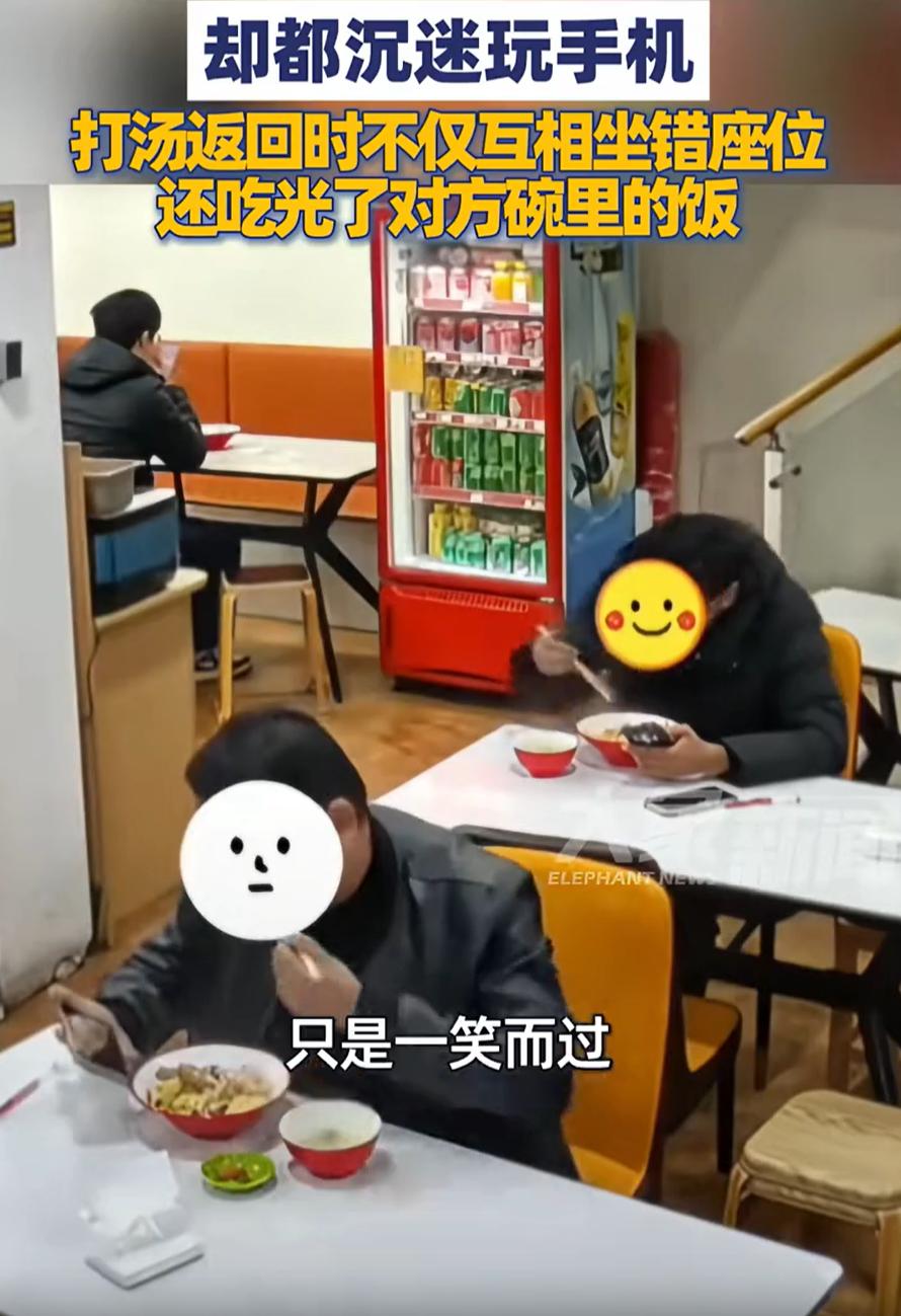 拜个把子吧!安徽合肥,两名陌生男子在餐馆吃猪脚饭,期间两人都沉迷于看手机,甚至打汤回来时,互相做错位置,吃错了饭都没有发现,最后还是一名男子返回找手机,才被老板提醒了一句,网友:男人果然是不拘小节 店内监控显示,两个人一前一后的坐着,不过两人的动作却相当同步,一人拿着一个手机横屏过来看视频,打汤的时候也是一前一后,唯一不同的,可能就是两人一个左撇子,一个右撇子,还有一名男子有两个手机 不过两人连打汤的时候都看手机,所以完全没意识到坐错了位置,两个人就这么自然的坐在对方的位置上,吃光了对方的猪脚饭 老板表示,后来一名男子反应过来桌上的手机忘了拿,返回店里寻找时他告知了刚才的情况,但男子却并没有在意 其实想想也挺有意思的,如果不是最后回来找手机,他们可能永远不知道,自己曾经在某个中午,和一个陌生人交换了一碗面,也短暂交换了座位和视角 有网友说:我开餐饮的,有很多客人都是坐在同一个桌上,各看各的手机,各喝各的酒,很少说话,注意力都在手机上,不是聊天就是刷手视频 确实,如果换个角度来看,现在手机等各种外部干扰越来越多,人际关系也因此变得疏远、机械。像这种“无意识吃错面”的情况,虽然有点可笑,却也说明现在低头族都忽略了对身边事物的敏感度和判断力 也许,在某些时候,我们需要放慢脚步,抬头看看身边的人和事,不要总是忙得连自己吃了什么都不记得
