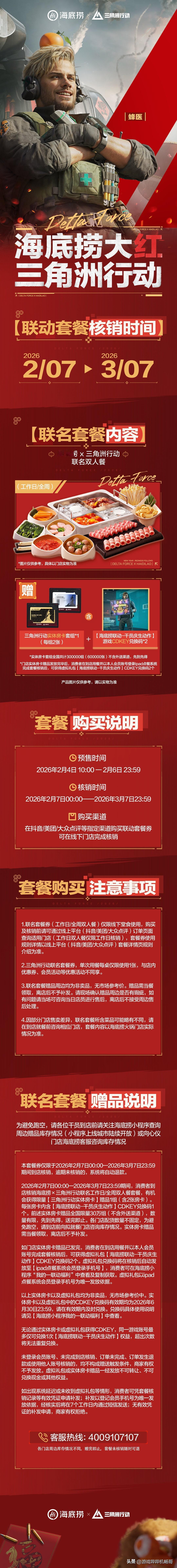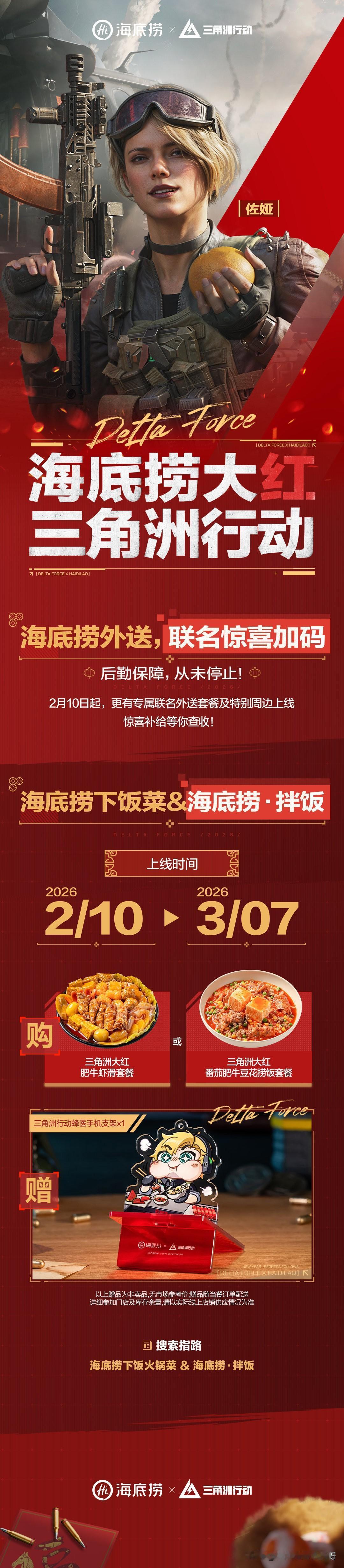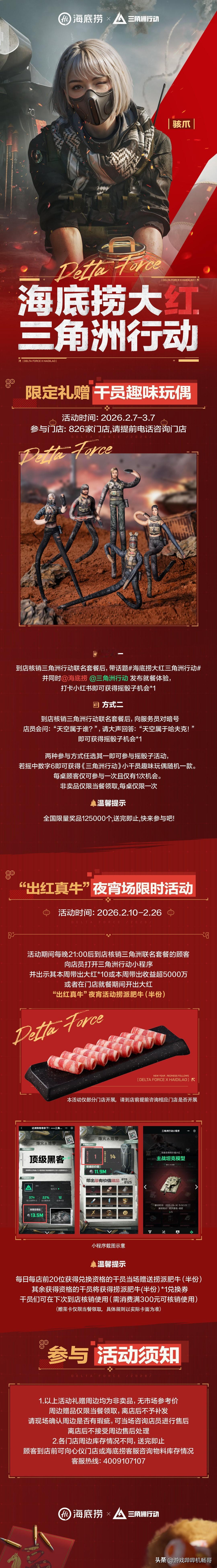 全体特种干员集合!海底捞×三角洲行动联动炸场,刘涛送红运福利! 干员们!谁懂啊!《三角洲行动》这波新春联动,直接把排面拉满——大红人刘涛空降送福利,还和海底捞搞出“捞大红”联名套餐,这波双厨狂喜必须冲! 2月4日预售已开,双人餐239元拿下原价292元的硬菜,还送专属干员庆生动作、限定房卡,杯套、围裙、火箭燃料水壶这些周边直接拉满仪式感!2月7日全国门店上线,主题店打卡超出片~ 更狠的是游戏福利!2月10日起7天登录,2600三角券+11款传说武器外观免费嫖,海量物资拿到手软,刘涛直接送6套红运礼包,新春接着红不是吹! 划重点:线下对暗号“天空属于哈夫克”,就能摇骰子赢干员玩偶!核销到3月7日,边吃火锅边领游戏福利,这波血赚不亏~ 特种兵们赶紧冲预售,锁定主题店地址,新春捞福又捞装备,冲就完事了! 三角洲行动 海底捞