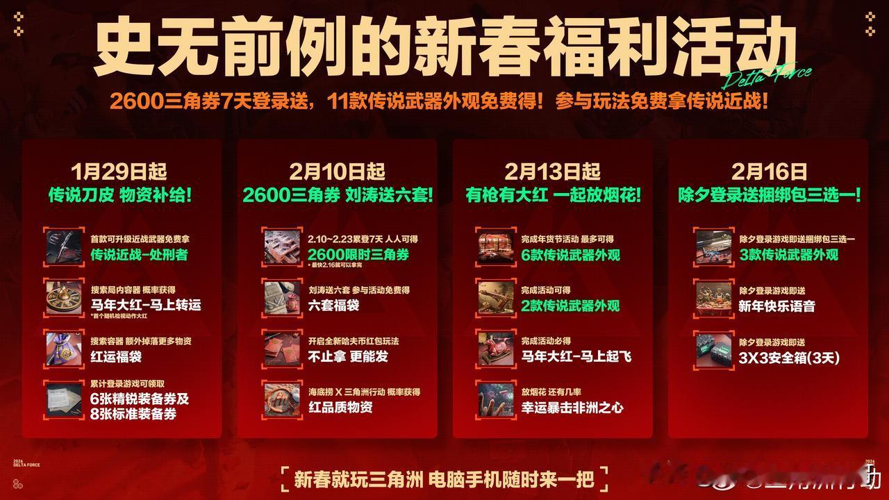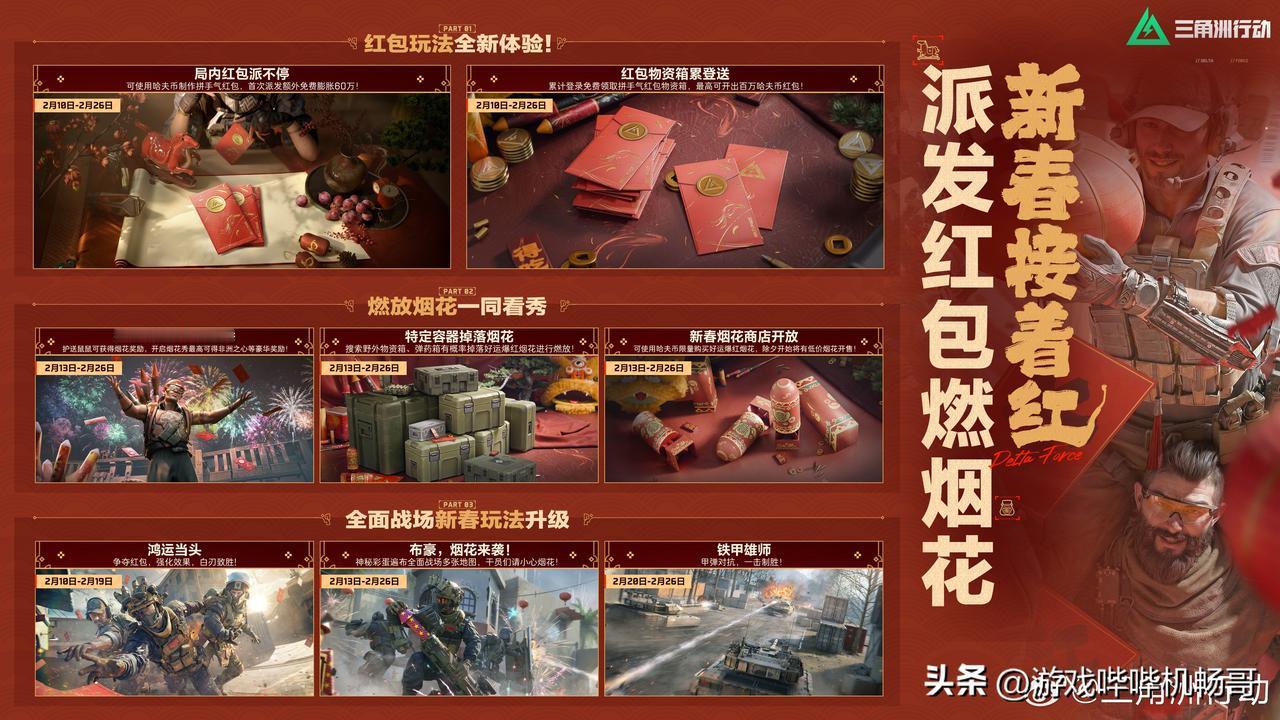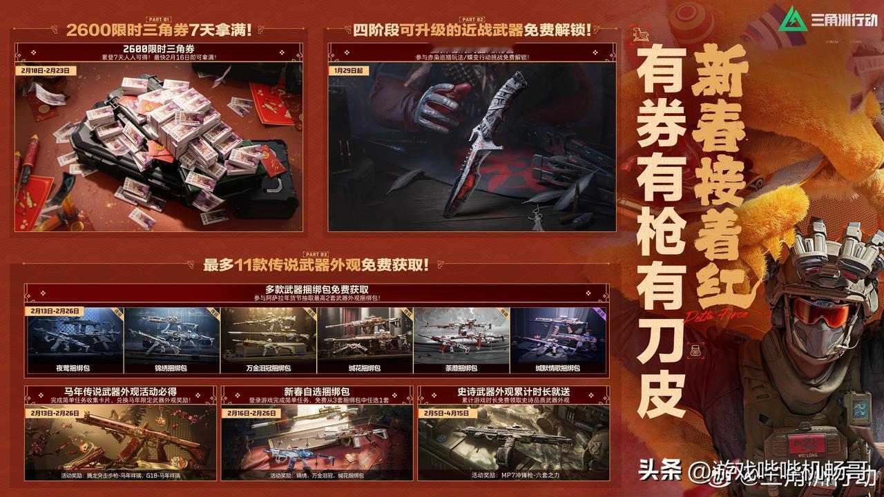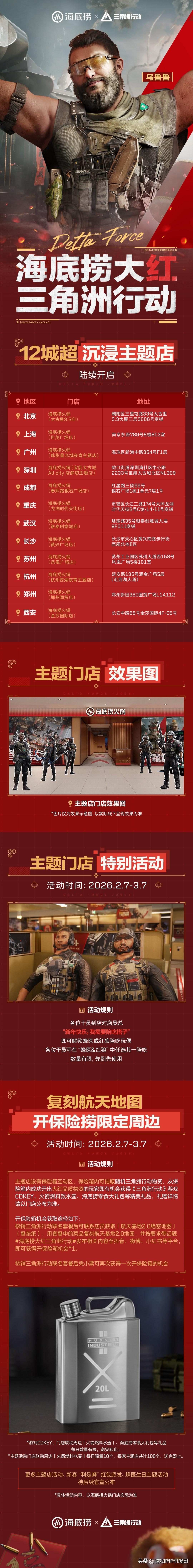 全体特种干员集合!海底捞×三角洲行动联动炸场,刘涛送红运福利! 干员们!谁懂啊!《三角洲行动》这波新春联动,直接把排面拉满——大红人刘涛空降送福利,还和海底捞搞出“捞大红”联名套餐,这波双厨狂喜必须冲! 2月4日预售已开,双人餐239元拿下原价292元的硬菜,还送专属干员庆生动作、限定房卡,杯套、围裙、火箭燃料水壶这些周边直接拉满仪式感!2月7日全国门店上线,主题店打卡超出片~ 更狠的是游戏福利!2月10日起7天登录,2600三角券+11款传说武器外观免费嫖,海量物资拿到手软,刘涛直接送6套红运礼包,新春接着红不是吹! 划重点:线下对暗号“天空属于哈夫克”,就能摇骰子赢干员玩偶!核销到3月7日,边吃火锅边领游戏福利,这波血赚不亏~ 特种兵们赶紧冲预售,锁定主题店地址,新春捞福又捞装备,冲就完事了! 三角洲行动 海底捞