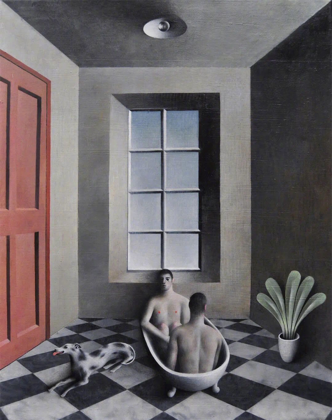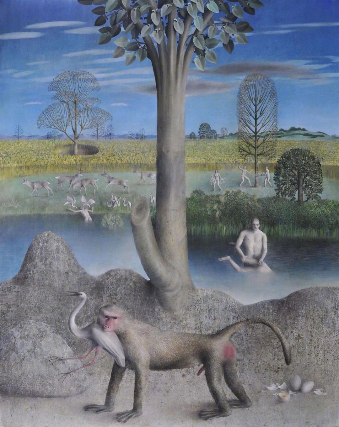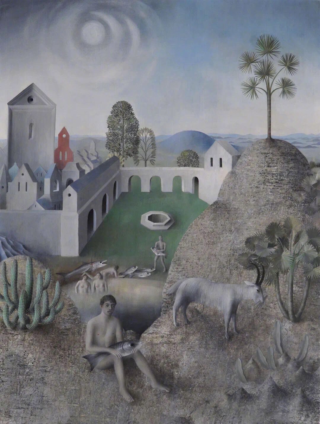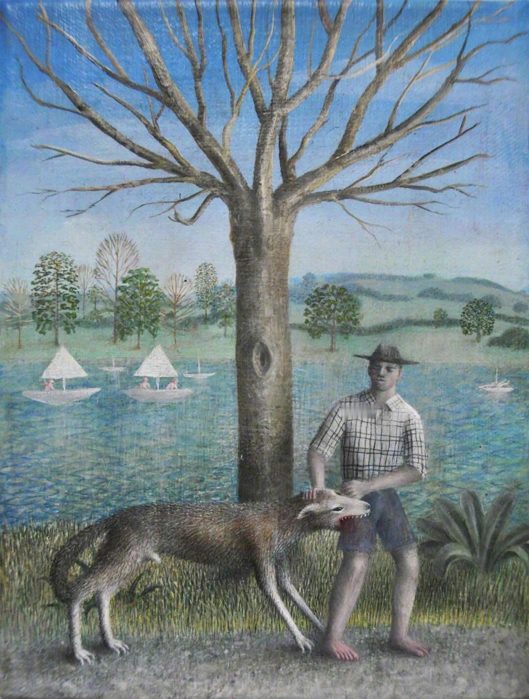James Mortimer詹姆斯·莫蒂默 b 1989年 英国詹姆斯·莫蒂默的创作以古老民间传说与神话为母题,作品呈现出超现实主义风格。他常以现代人的理性视角解构传统寓言,画面中常出现打破物种界限的形象并置,如男孩与动物等以等比尺度共处,植物与水果被赋予人性化表情,营造出荒诞而富有诗意的视觉效果。