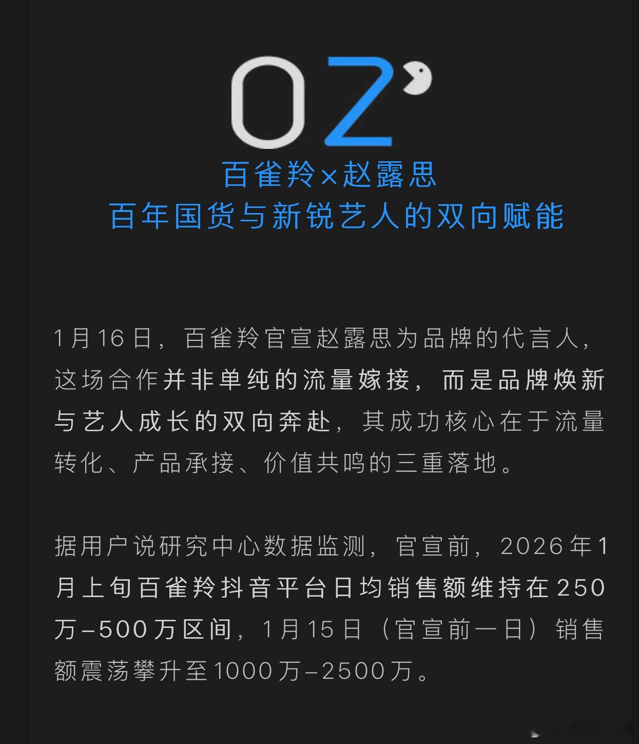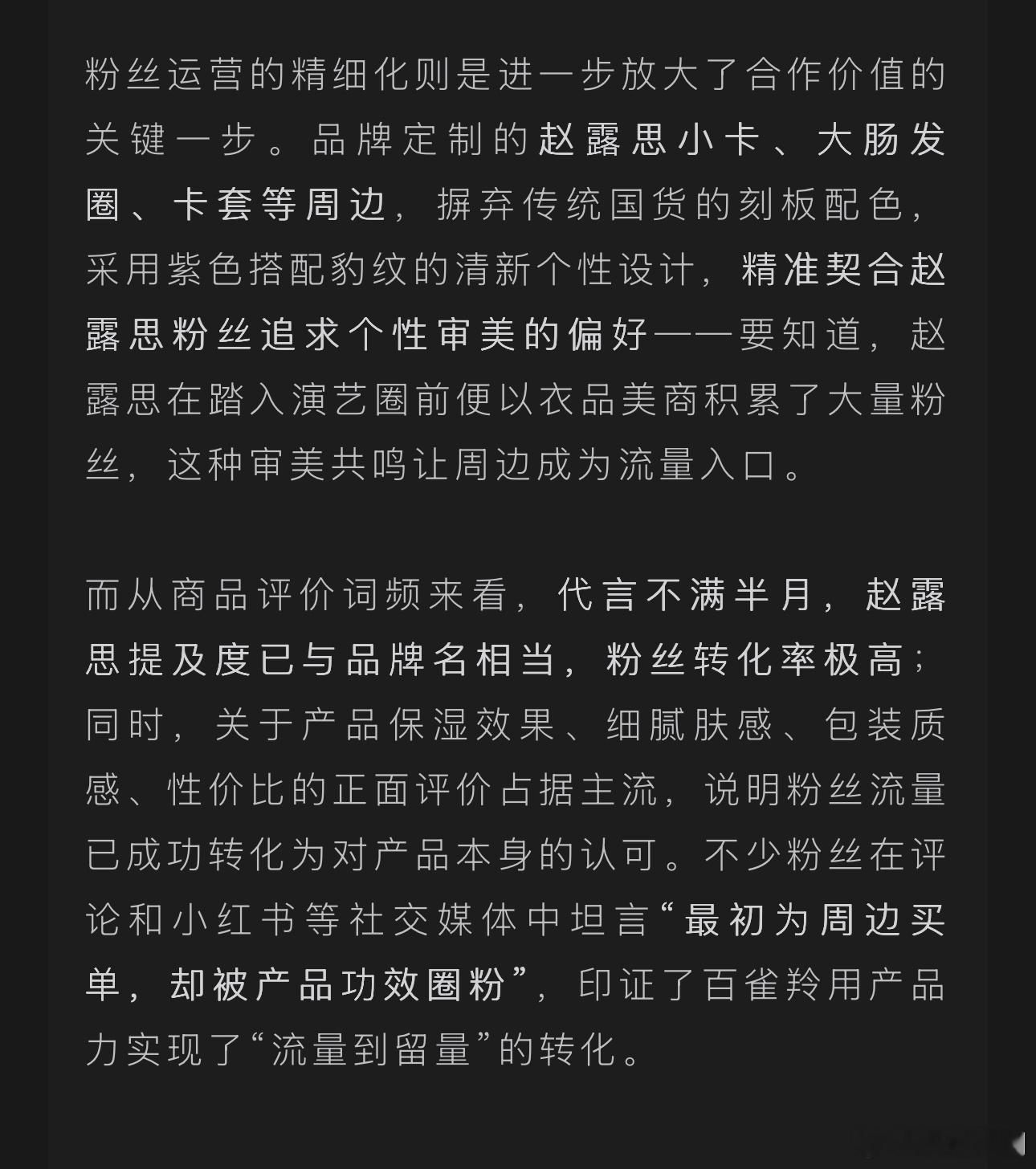 美妆业内报道赵露思代言百雀羚品牌:百雀羚官宣赵露思为品牌的代言人,这场合作并非单纯的流量嫁接,而是品牌焕新与艺人成长的双向奔赴,其成功核心在于流量转化、产品承接、价值共鸣的三重落地。代言不满半月,赵露思提及度已与品牌名相当,粉丝转化率极高;同时,关于产品保湿效果、细腻肤感、包装质感、性价比的正面评价占据主流,说明粉丝流量已成功转化为对产品本身的认可。不少粉丝在评论和小红书等社交媒体中坦言“最初为周边买单,却被产品功效圈粉”,印证了百雀羚用产品力实现了“流量到留量”的转化。