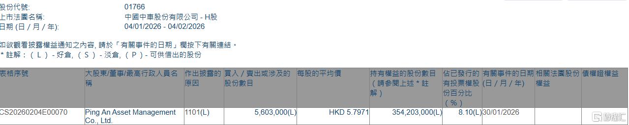 格隆汇2月4日丨根据联交所最新权益披露资料显示,2026年1月30日,中国中车(01766.HK)获PingAnAssetManagementCo.,Ltd.在场内以每股均价5.7971港元增持560.3万股,涉资约3248.12万港元。