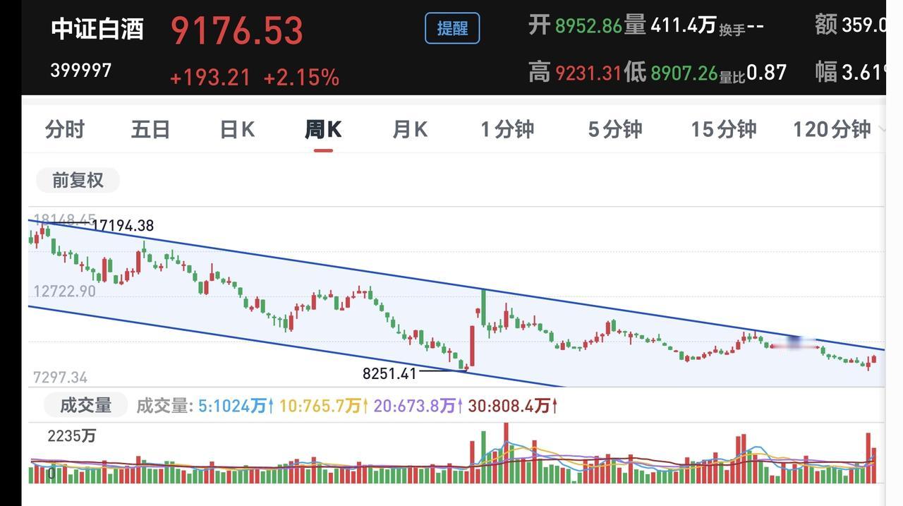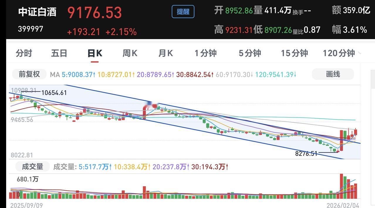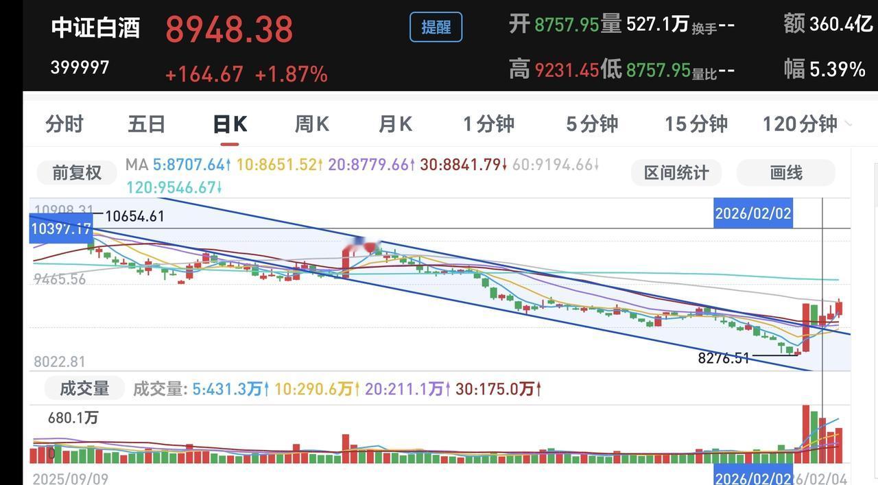 基金:怎么样才能持有热门板块 日本和韩国市场今天涨跌不一,日本下跌了0.78%,韩国上涨了1.57%。 香港市场今天也是涨跌不一,恒生指数上涨了0.05%,国企指数下跌了0.05%,恒生科技指数下跌了1.84%。 持有的基金净值大部分已经更新,上涨幅度最大的三个板块是:白酒板块,大消费板块,军工板块,下跌幅度最大的三个板块是:AI应用板块,5G板块,半导体板块,净值暂时亏损了2751元。 持有的基金中,今天上涨幅度最大的是白酒板块,净值更新上涨了2.15%,我们来看一下下面的截图5,这是白酒板块日K线图,今天盘中最高9231.31点,看下面的截图6,这也是白酒板块日K线图,2月2号盘中最高是9231.45点,也就是今天并没有创大阳线以来的新高,明天需要继续上涨,明天需要创一个新高才行。 看下面的截图7,这是白酒板块周K线图,现在的位置处于下跌通道内,距离下跌通道的上轨线并不远,连续两根中大阳线,就可以突破这个下跌通道的上轨线,只有突破了周线级别下跌通道的上轨线,才能考虑这个板块是不是已经反转,现在谈反转还为时过早,所以,近期需要继续上涨,继续有中大阳线才行。 今天的盘面出现了一个变化,大盘指数是上涨的,但大部分前期热门板块是下跌的,大家所谓的老登股是上涨的,这会不会是后面的常态,这是不是后面市场风格的转换,现在还做不出判断,还需要继续观察,但只要我们是均衡配置的,我们就不要担心它是什么风格,我前段时间配置白酒板块,就是在防止这样的变化,如果有这样的变化,我就正好进场了,如果没有这样的变化,这样的板块位置也是足够低。 均衡配置是我们每个人都需要考虑的问题,我们千万不要去追逐热门板块,当你知道哪个板块是热门板块的时候,这个板块的位置都是已经很高,我们只有潜伏,我们只有潜伏足够多的板块,这样才能增加我们持有热门板块的概率。 花一秒钟点赞,花三十秒钟评论,就是对我最大的支持,谢谢大家的支持。