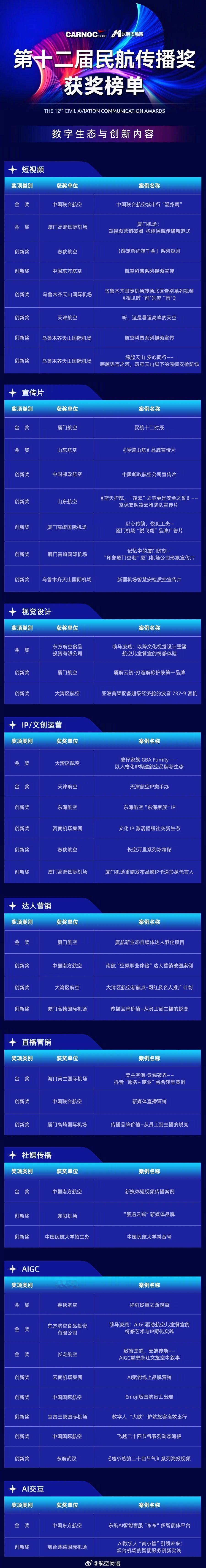 【第十二届民航传播奖获奖榜单重磅揭晓,大赢家是……】2月4日,由民航资源网主办的第十二届民航传播奖颁奖典礼在安徽广播电视台演播大厅举行。典礼以“价值回归”为主题,聚焦民航传播的长效价值构建。本届评选共收到来自航空全产业链的近300件申报案例,经多轮专业评审,最终评选出百余件优秀案例以及年度大奖,涵盖品牌建设、跨界融合、数字创新、AI应用等多个维度,集中呈现了民航传播在过去一年的创新探索与实践成果。