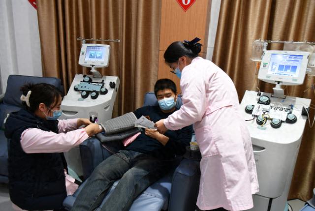 2月4日,青海省血液中心莫家街献血屋内,医护人员正通过血细胞分离机,为志愿者采集捐献的血小板。随着献血知识的普及,越来越多市民认识到血小板对白血病、癌症化疗患者等群体的重要性,志愿捐献者数量逐步增长。记者从西宁市红十字会获悉,“十四五”期间,西宁市民无偿献血累计达9.8万毫升;造血干细胞捐献入库血样3297人份,成功捐献11例,库容及捐献数量均居全省首位。