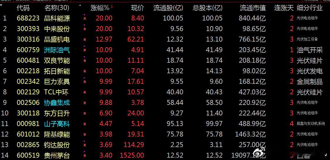 今日午盘:市场数据,人气最旺:板块热股:光伏电池、油气开采、光伏硅片等板块集体走强。主要受多:重政策利好与产业趋势共振推动,龙头企业表现亮眼。今天透视:行业热股。