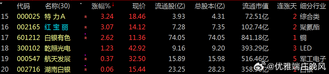 分别是:涨跌版、现价、流通股、总股本、流通市值、连涨天数、细分行业等排列。