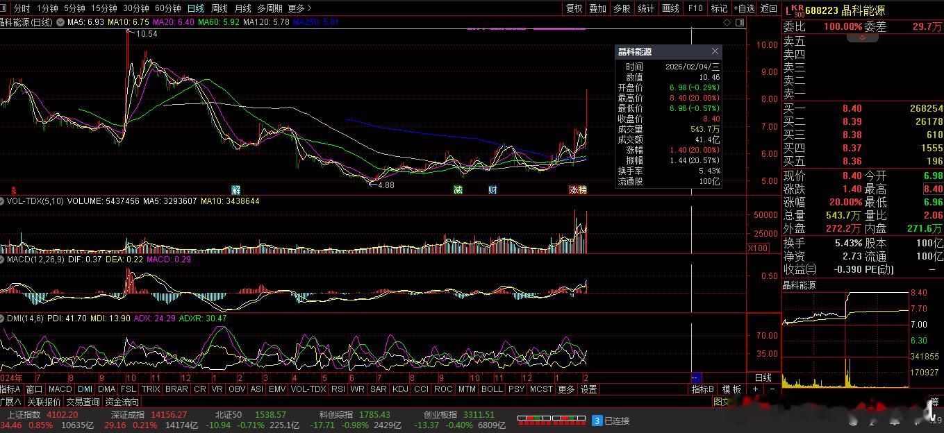 20CM涨停,涨停价8.4元,主力净流入5.43亿元,受马斯克团队考察、AI+钙钛矿合作落地等多重利好刺激。