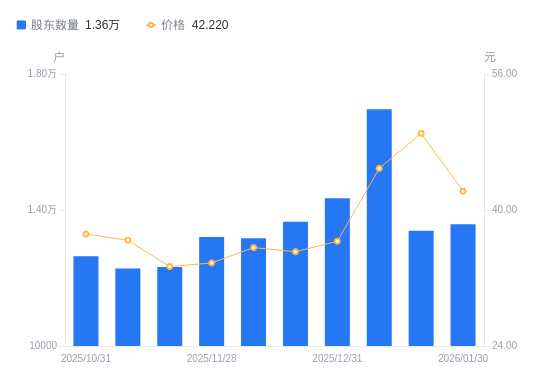 近一年(2025年2月10日至2026年1月30日),航天南湖A股股东户数从1.21万户,增加至1.36万户,增幅11.92%,区间股价上涨134.56%。