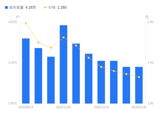 日期A股户数(户)流通A股户均持股数(股)户均持股市值(万元)2026-01-304160037817.538.552026-01-204160037817.538.662026-01-094220037279.848.652025-12-194220037279.848.802025-12-104290036671.548.982025-11-284390035836.209.212025-11-204570034424.719.122025-10-204260036929.799.422025-09-304345736201.519.412025-09-194440035432.649.89
