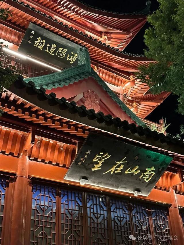 我在傍晚六点半踏上江堤步道,想怀古幽思白居易夜听琵琶吟的情景。夜幕正在落下,江风将一个嘶唱露天卡拉OK的男声吹得四处飘荡:“爱上你让我神魂颠倒,想你想得睡不着,忘记你我做不到……”大哥用破音唱出了痛彻心扉,强势地阻止了我对琵琶吟的努力怀古。江边的人们步伐缓缓,散步的散步,锻炼的锻炼,一旁的马路上车来车往。一年里走上街头不足五次的我,就像走进一场电影,仿佛看到擦肩而过的路人头顶上,不断飘落着绚烂的烟花。正当我要沉没在这红尘里的瞬间,脚下抵达了一座被夜景灯照得犹如仙境的楼阁,上面现出一块宁静的牌匾,写着四字:“南山在望。”