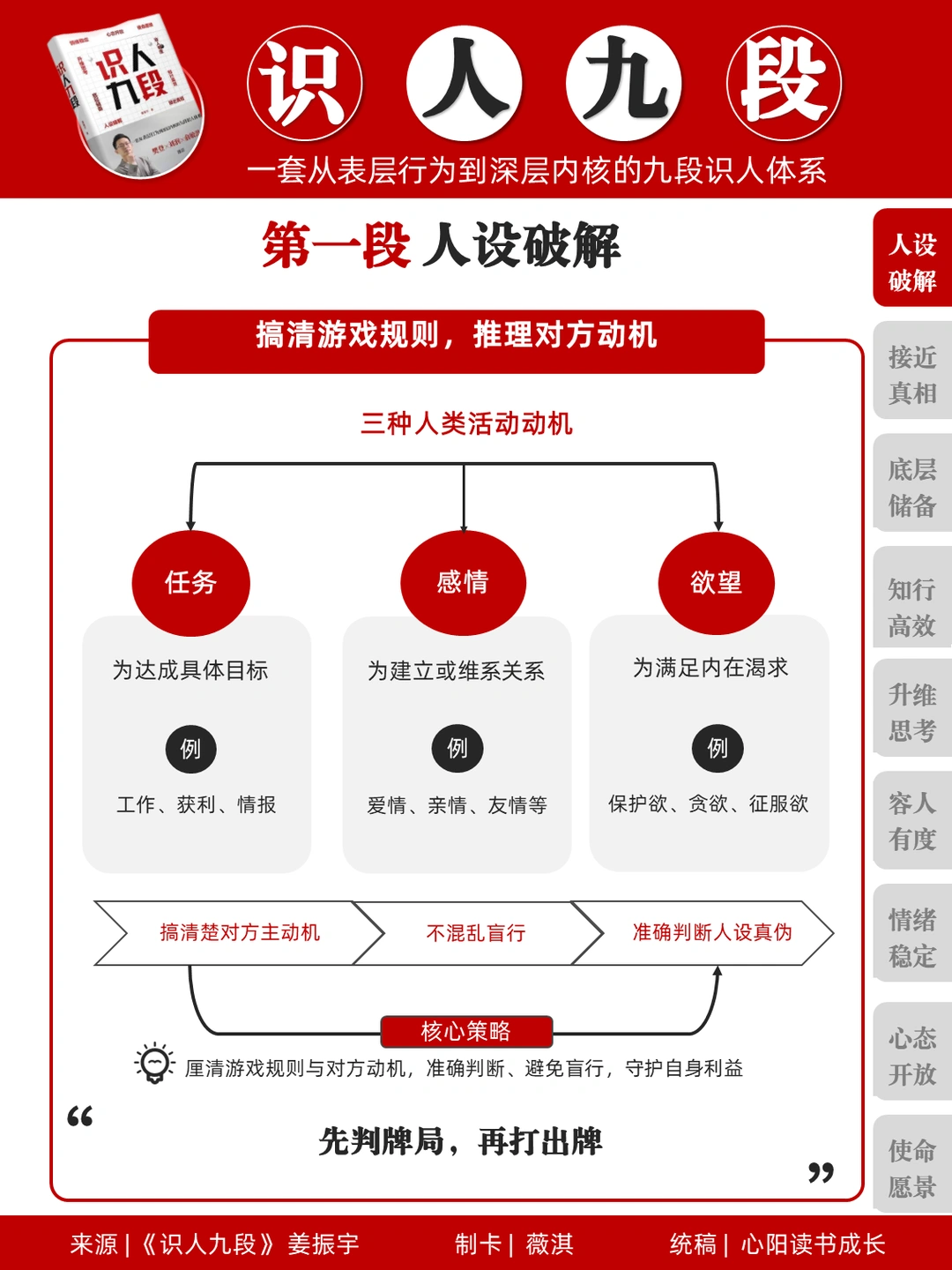 书中将识人能力拆解为九个进阶段位,如同游戏升级般层层递进:从初阶的人设破解、接近真相,到中层的底层储备、知行高效、升维思考,再到高阶的容人有度、情绪稳定、心态开放、使命愿景。九个步骤环环相扣,凝练为 “防止被骗→勘验过去→评估核心→预判未来” 四大阶段,形成完整的识人闭环,让识人有方法、有逻辑,不再靠直觉。