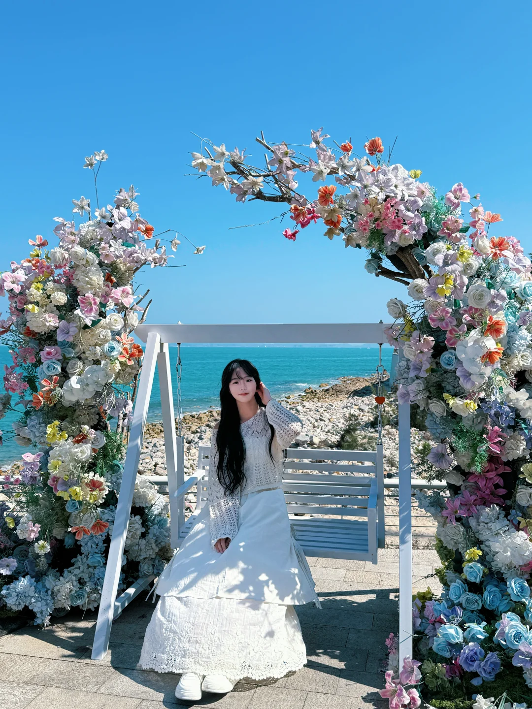 这边有秋千、花海、许愿墙等打卡点,拍照都挺出片的,也可以在礁石这里拍照🪨,也很好看呢