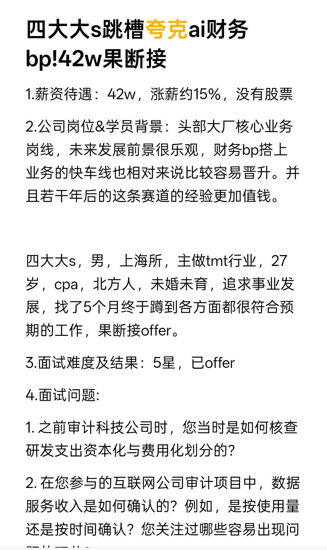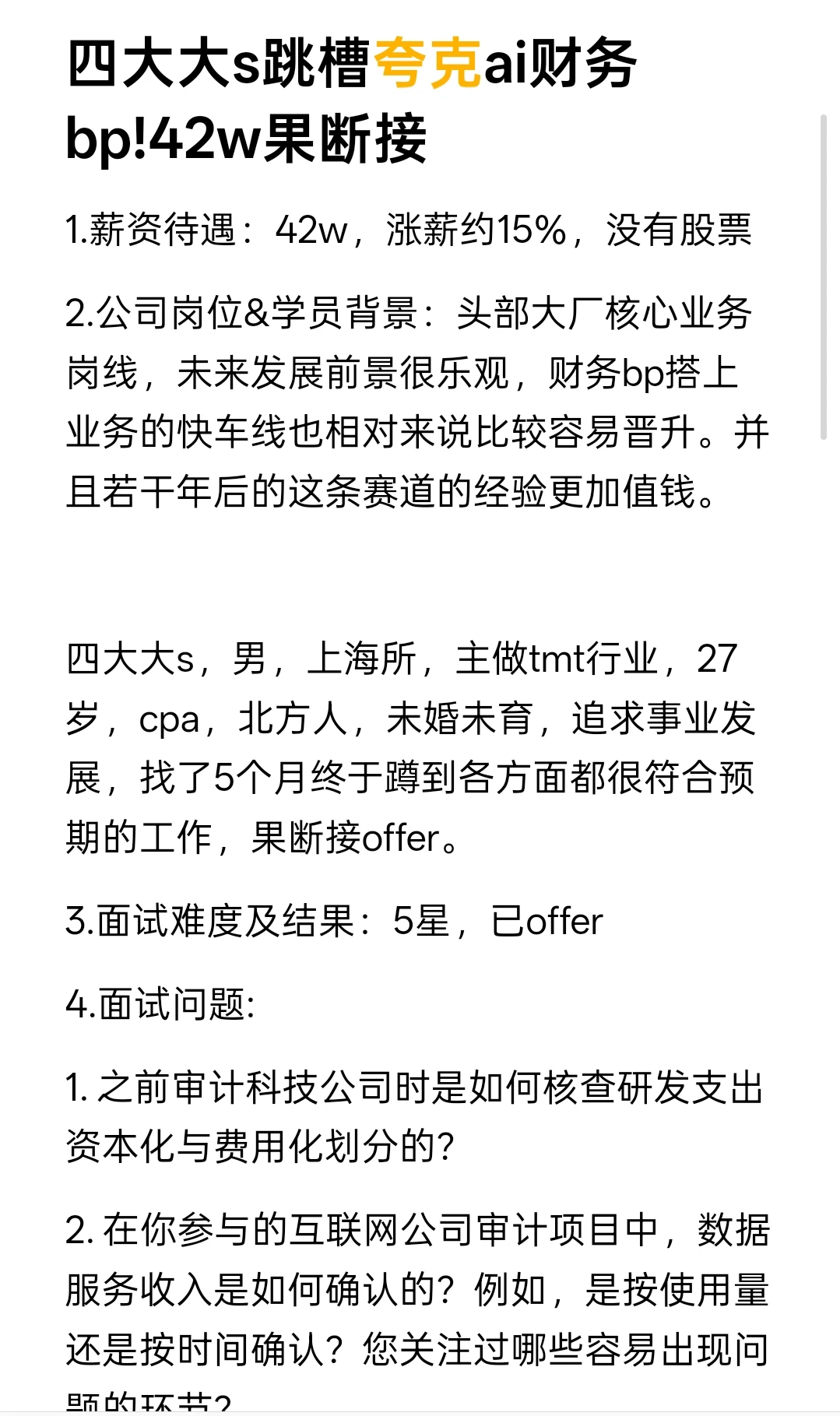 四大大s,男,上海所,主做tmt行业,27岁,cpa,北方人,未婚未育,追求事业发展,找了5个月终于蹲到各方面都很符合预期的工作,果断接offer。