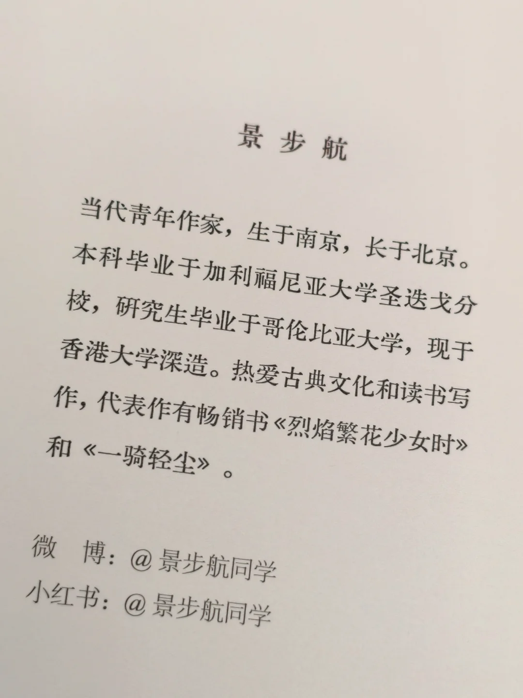 对景步航的认识,始于那本挚爱的《烈焰繁花少女时》。她的文字简洁流畅又不失典雅,既有古典文学的韵味,又通俗易懂,读起来毫无障碍。她用寥寥数语就能勾勒出一个生动的场景,或刻画一个鲜明的人物形象,让我沉浸其中,欲罢不能。