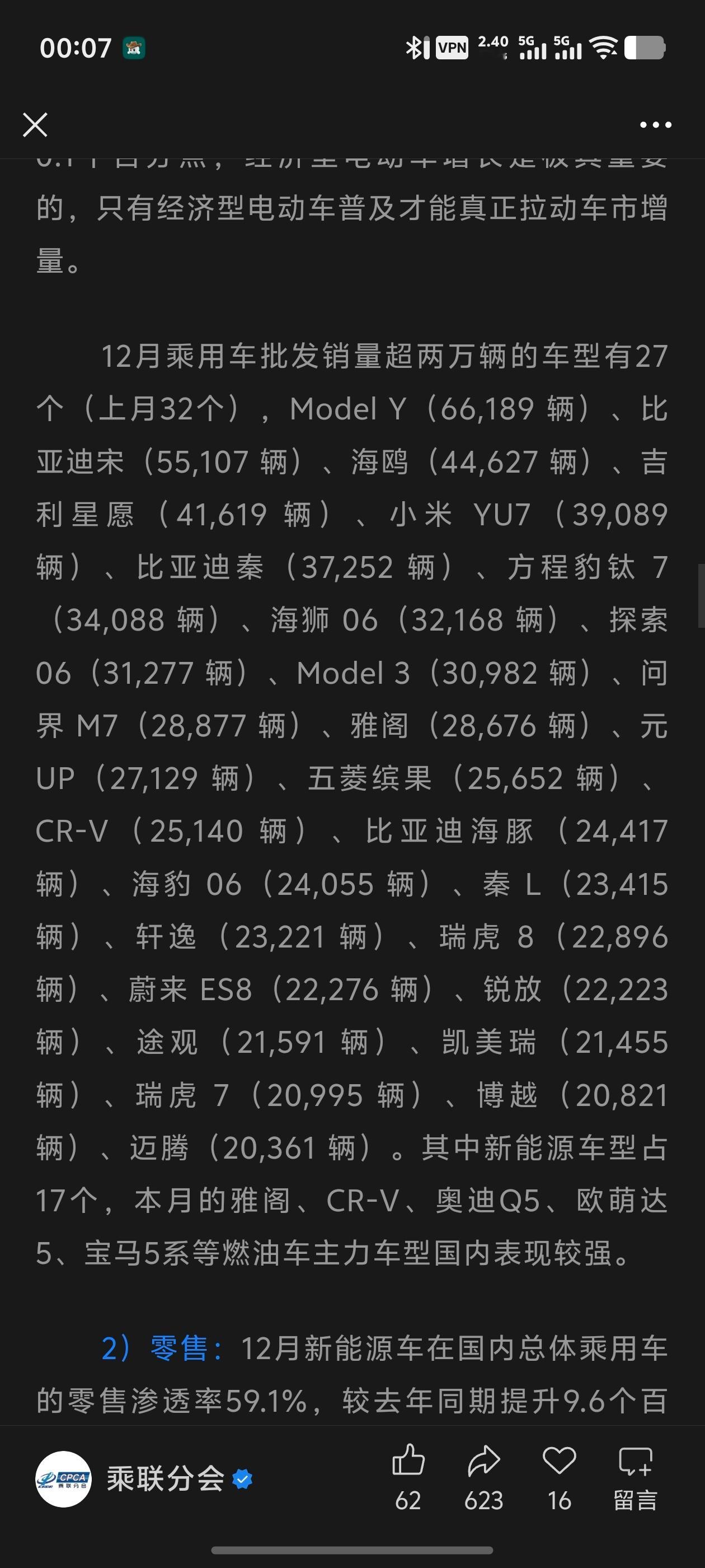 乘联会批发销量,今年 1 月 VS 去年 12 月,总体打 6 折。