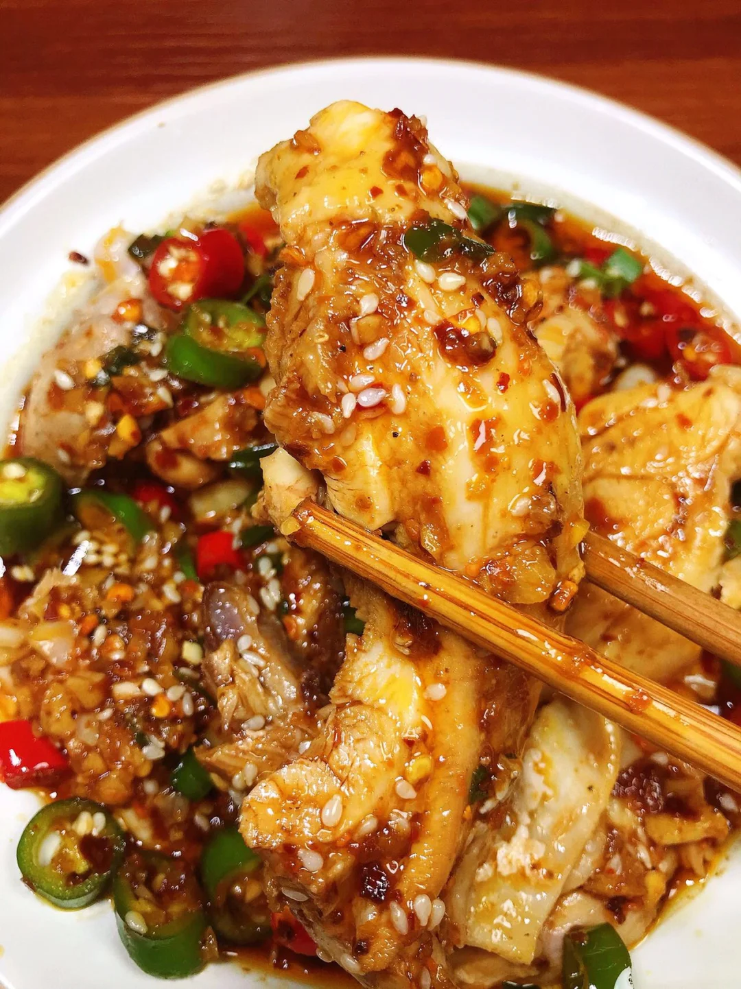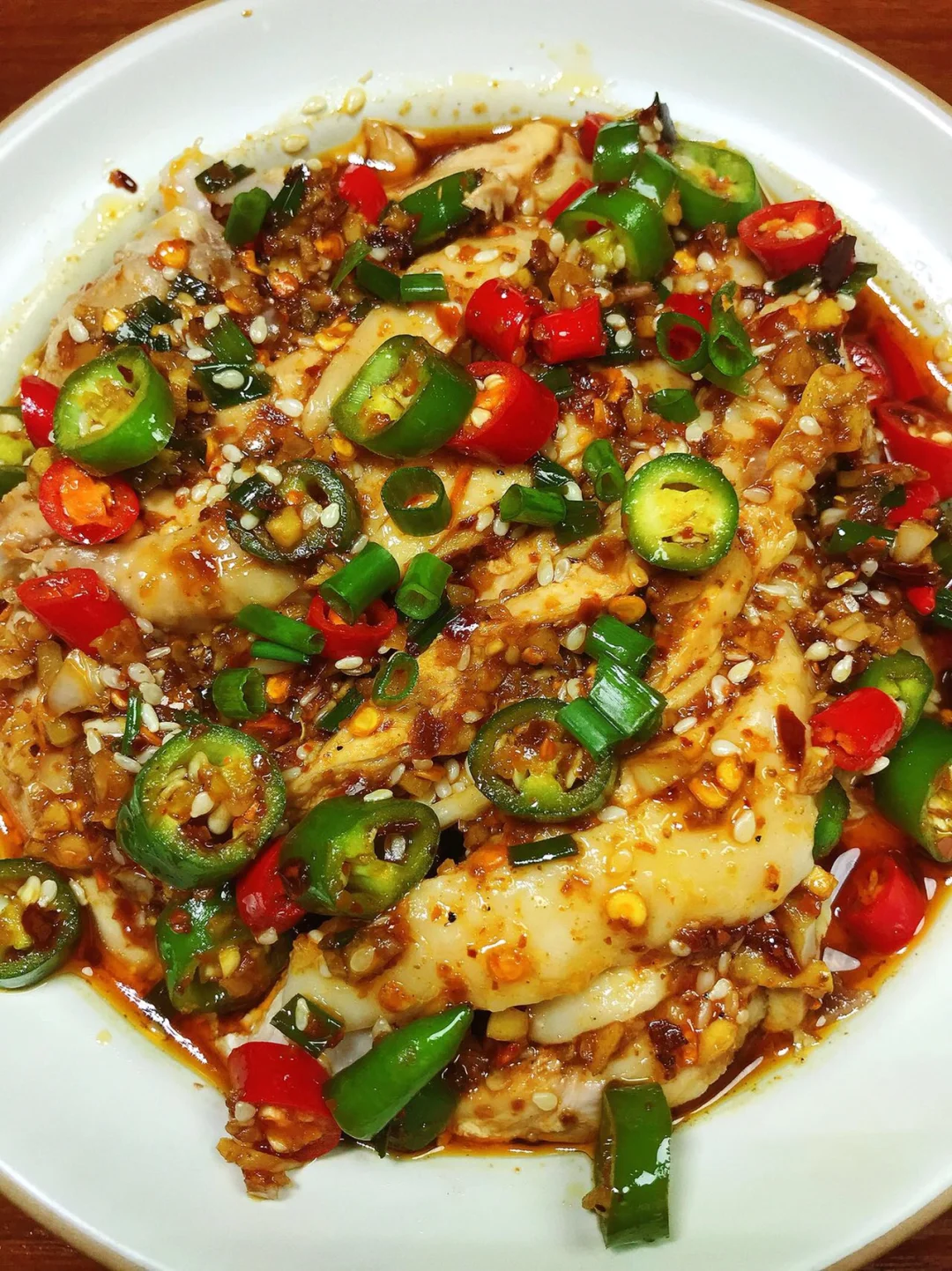 2⃣️料汁:碗中放入姜蒜末、辣椒面、白芝麻、葱花浇上热油;再放入2勺生抽、半勺老抽、1勺蚝油、1勺花椒油、1勺香油,少许鸡精、花椒粉、白糖,放入青红辣椒,倒入一勺煮鸡腿的汤搅拌均匀