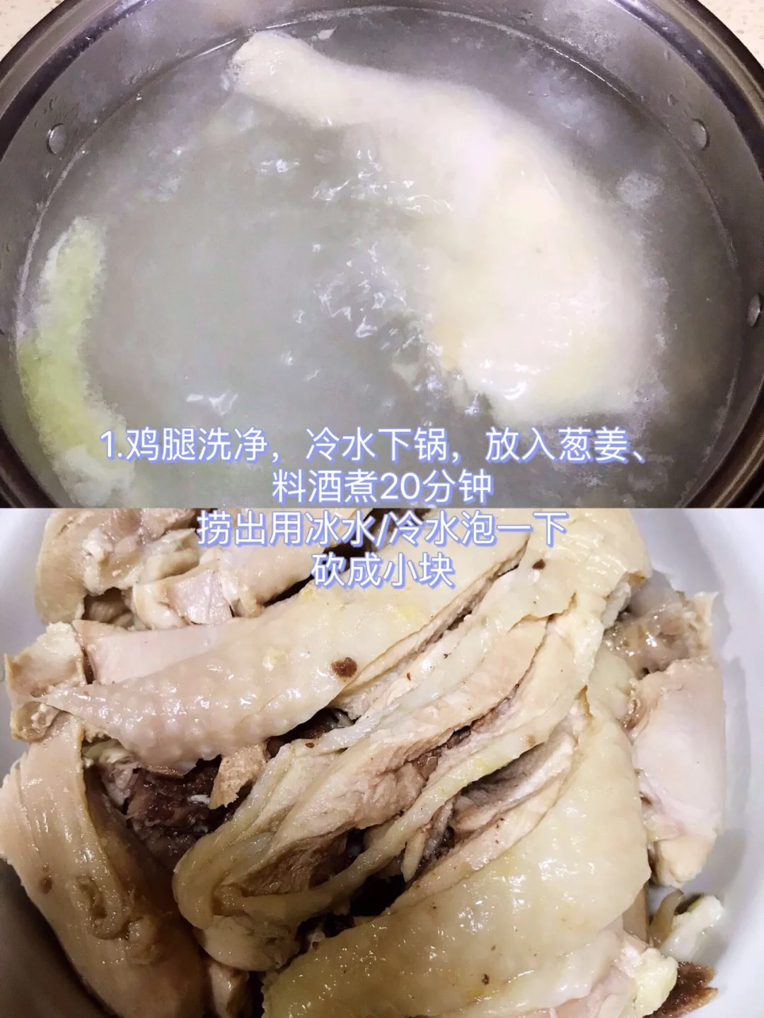 1⃣️鸡腿洗净,冷水下锅,放入葱姜、料酒煮20分钟捞出用冷水/冰水泡一下,砍成小块