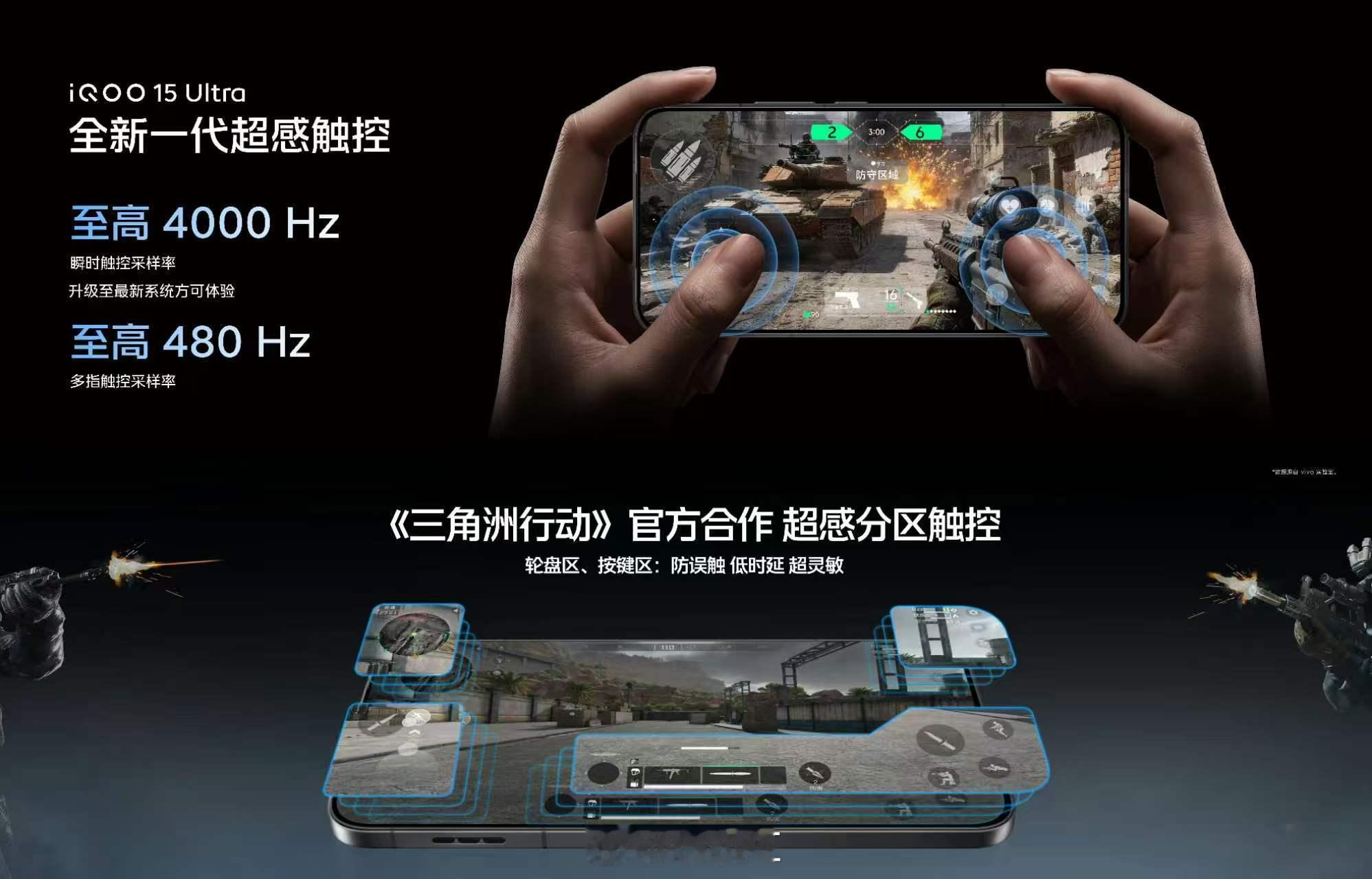 iQOO15 Ultra新品发布 超感游戏操控系统拉满操作上限!超感肩键600Hz采样率,热门游戏触发响应速度低至32毫秒,超感陀螺仪500Hz采样率,结合iQOO自研超感疾速算法,能实时捕捉你的手部细微动作,超感触控至高4000Hz瞬时采样率,还与《三角洲行动》合作推出超感分区触控,专项优化杜绝断触,轮盘操控更精准。
