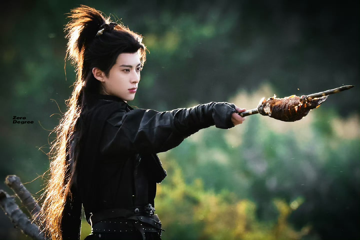 王鹤棣你神图有了少年仗剑林间,黑衣猎猎超带感!🔥手持烤鱼眼神凌厉,这武侠氛围感