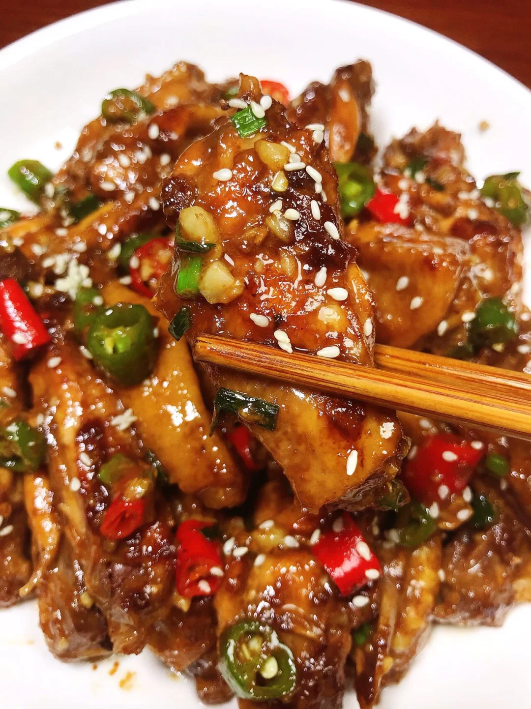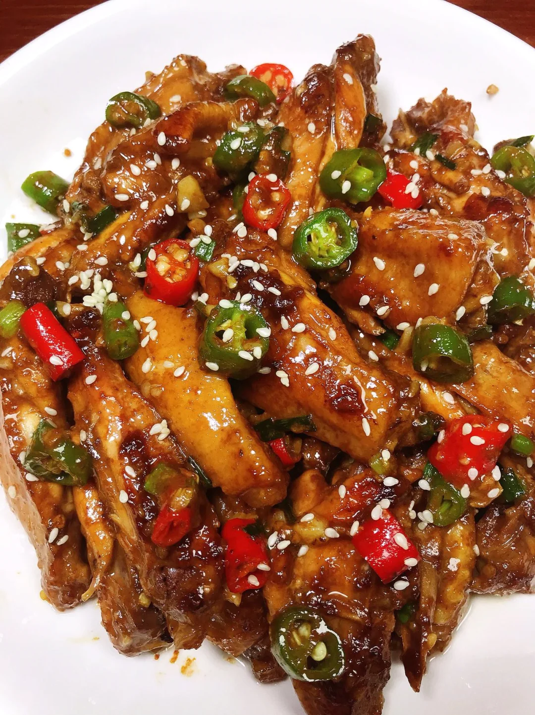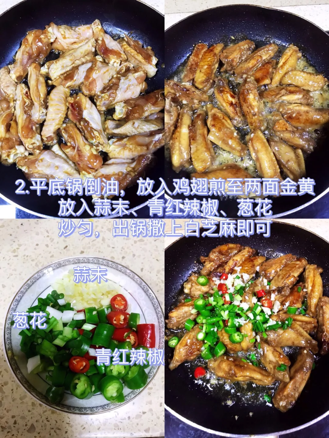 2⃣️平底锅倒油,油热放入鸡翅煎至两面金黄,放入蒜末、青红辣椒、葱花炒匀,出锅撒上白芝麻即可