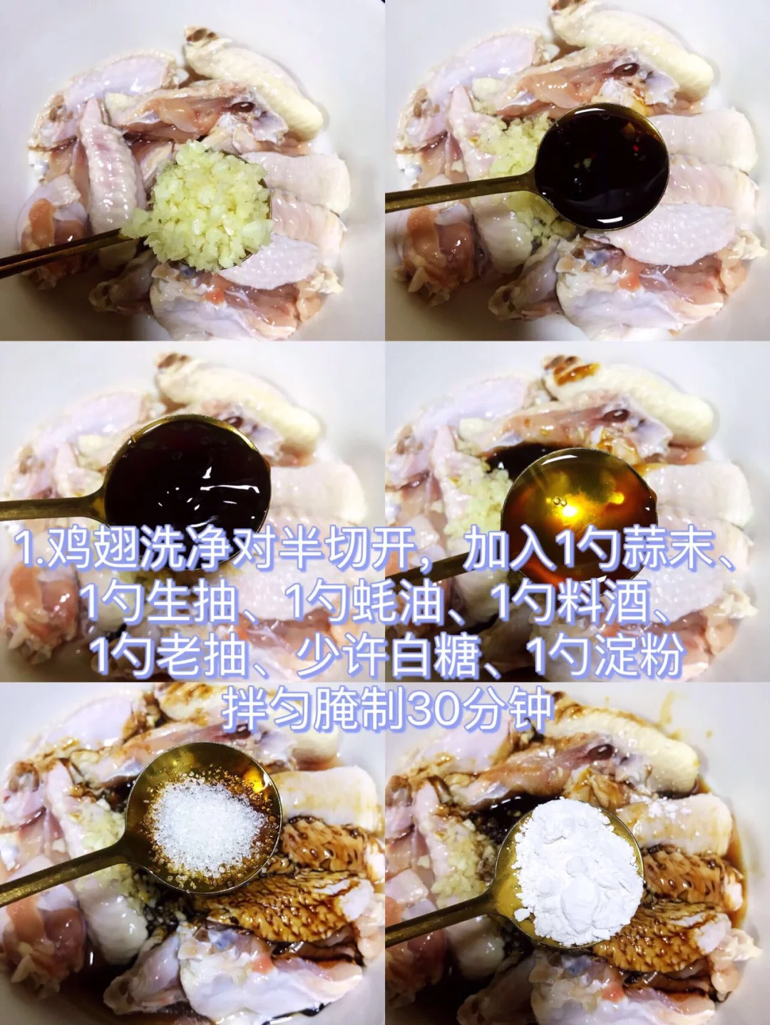 1⃣️鸡翅洗净对半切开,加入1勺蒜末、1勺生抽、1勺蚝油、1勺料酒、1勺老抽、少许白糖、1勺淀粉拌匀腌制30分钟