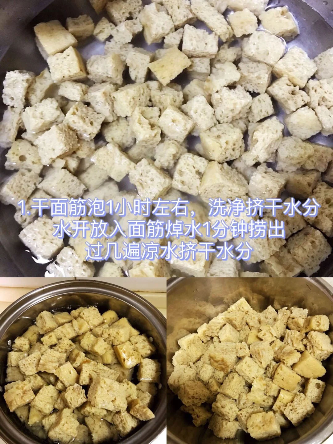 1⃣️干面筋泡1小时左右,洗净挤干水分;水开放入面筋焯水1分钟捞出过几遍凉水挤干水分装入盆中