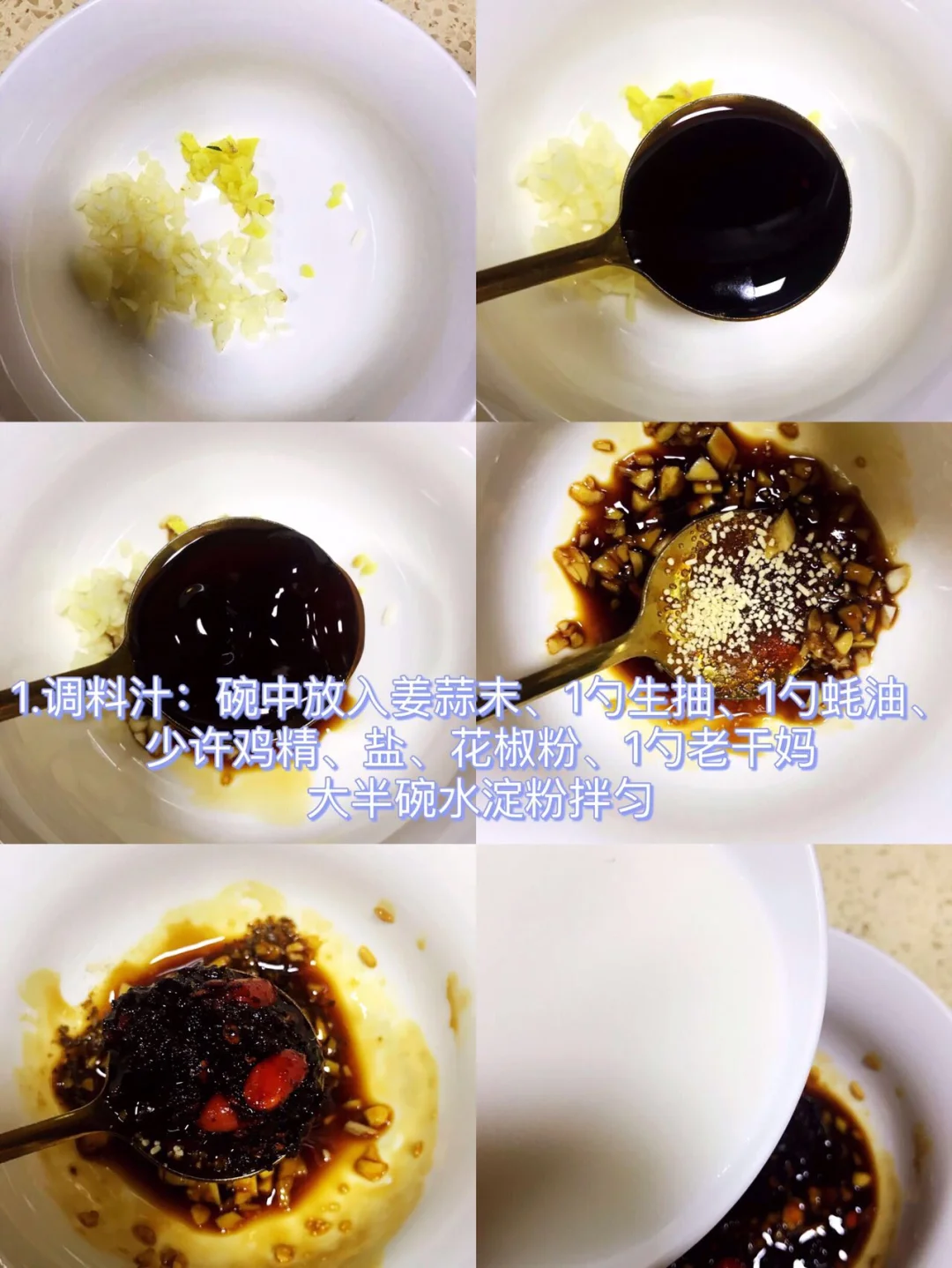 1⃣️姜蒜切末;调料汁:碗中放入姜蒜末、1勺生抽、1勺蚝油、少许鸡精、盐、花椒粉、1勺老干妈,倒入大半碗水淀粉拌匀