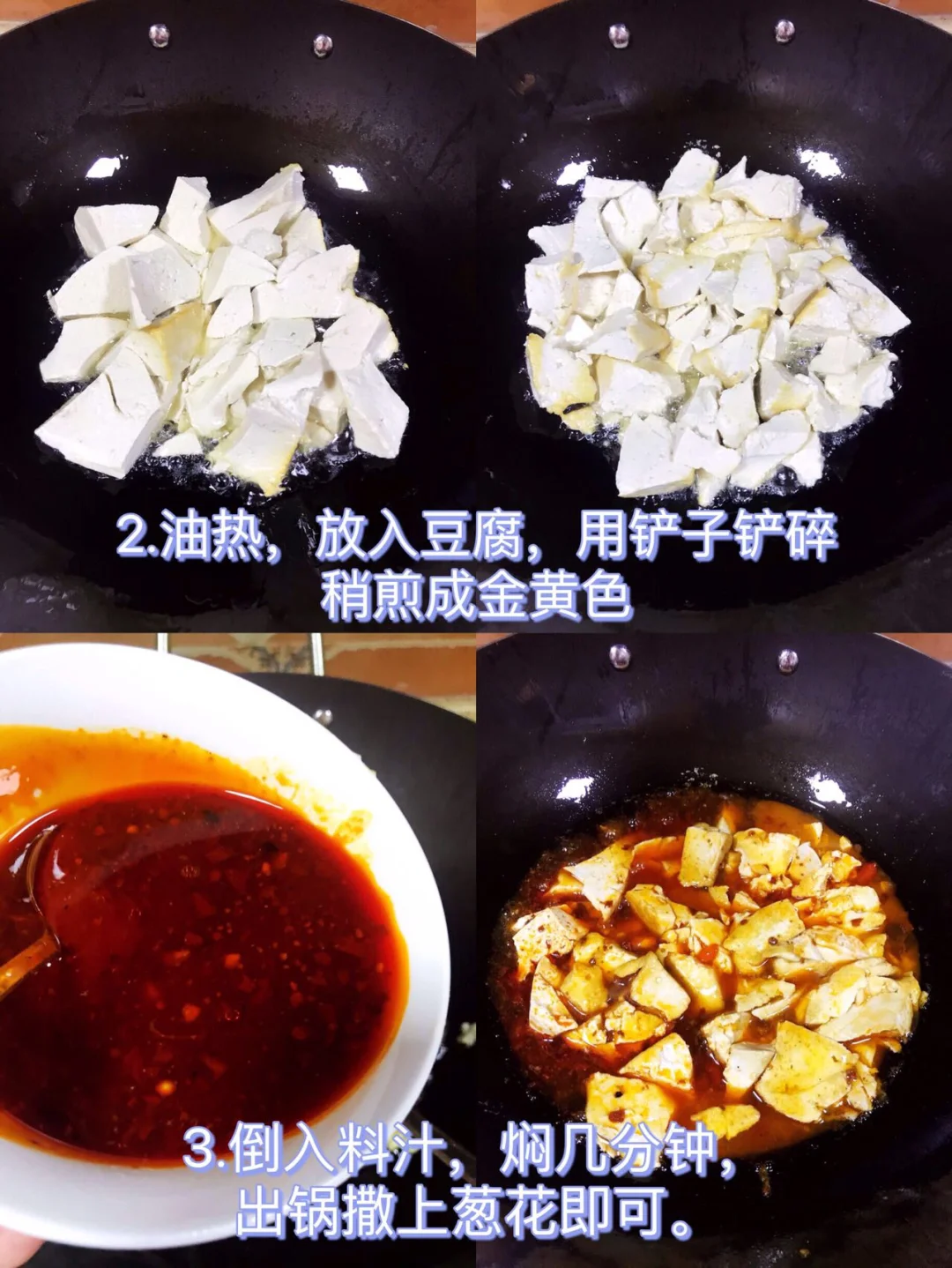 2⃣️油热,放入豆腐,用铲子铲碎稍煎成金黄色