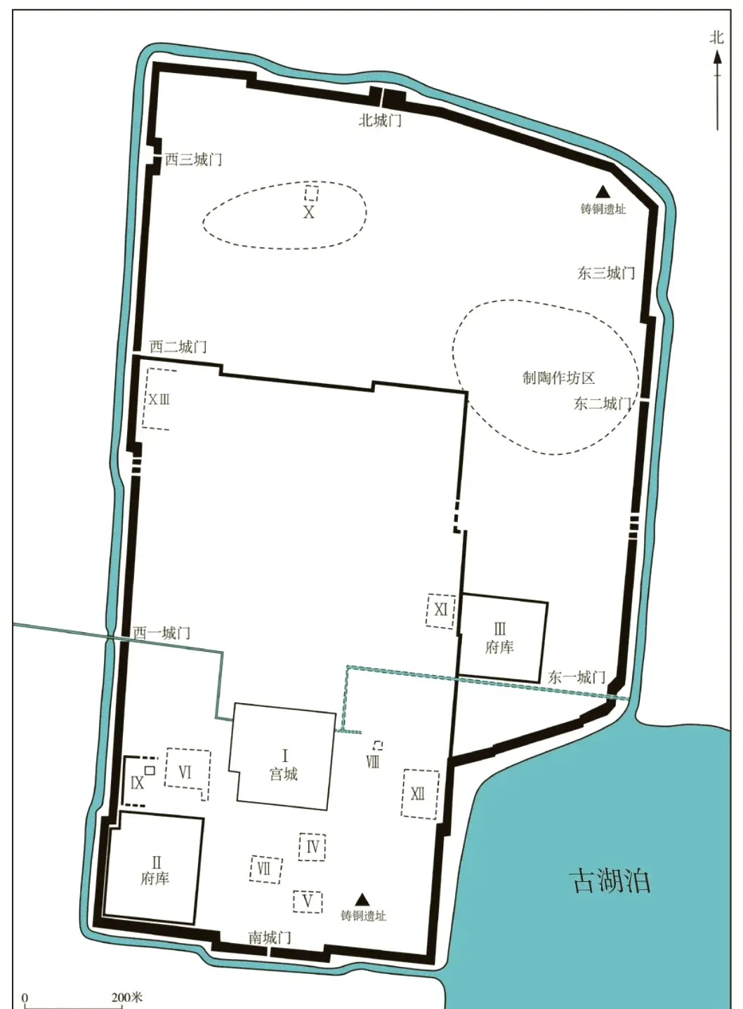 ,内有大型宫殿建筑和军事防御设施,城内的排水设施完备,护城壕、排水沟、大渠一应俱全,街道纵横,王城、府库、兵营、城门排列井然有序。