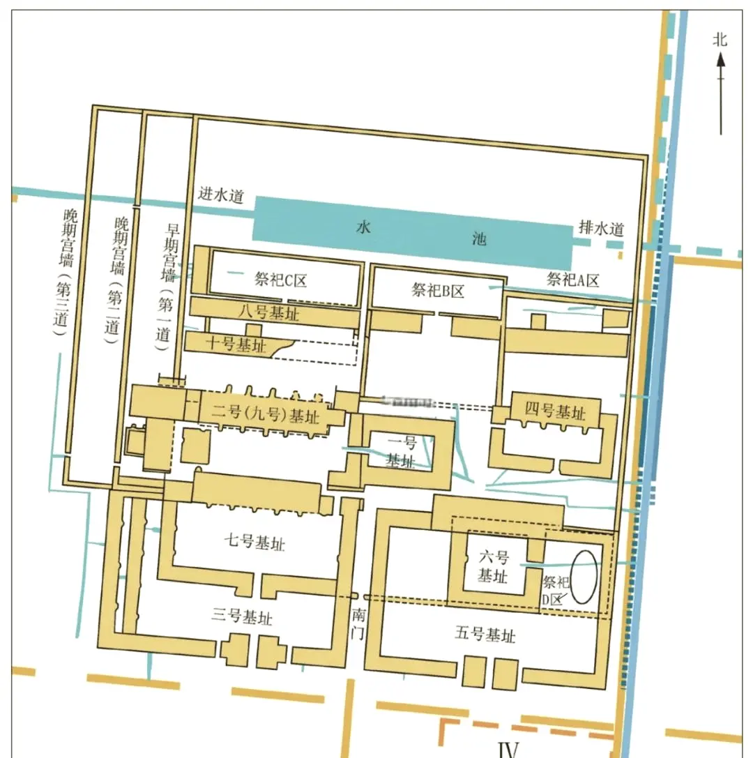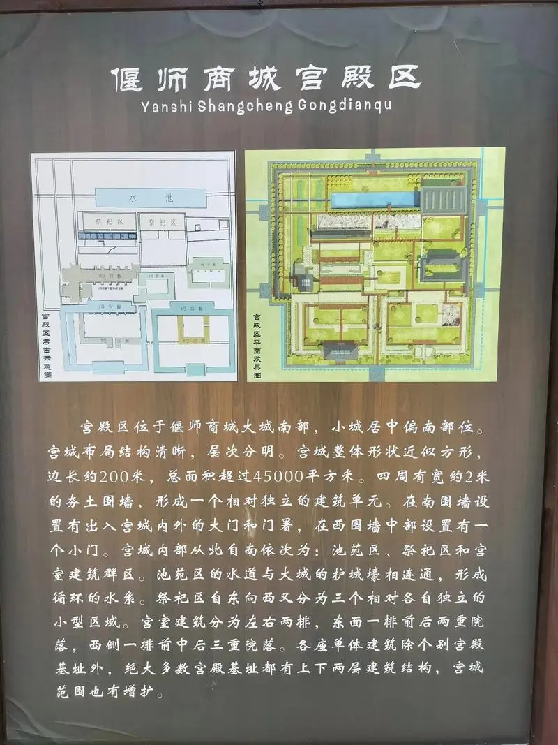 偃师商城遗址平面呈长方形,由宫城、小城和大城三重城垣及多组宫殿建筑基址组成。它是分两期建成的,先建了一座小城,大约过了五六十年后,又建了一座大城。