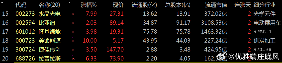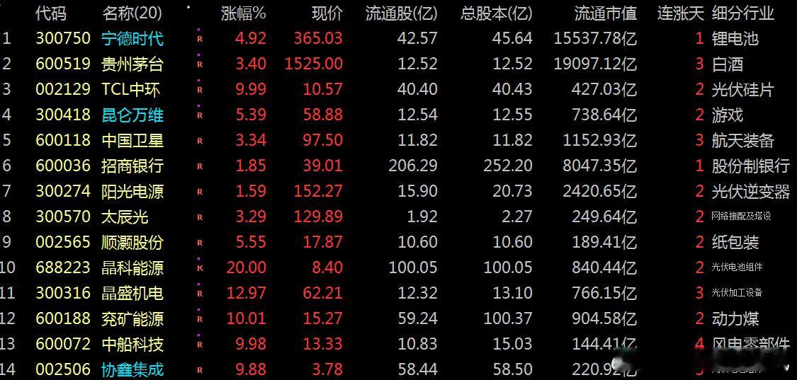 列表之二:分别是:涨跌版、现价、流通股、总股本、流通市值、连涨天数、细分行业等排列。