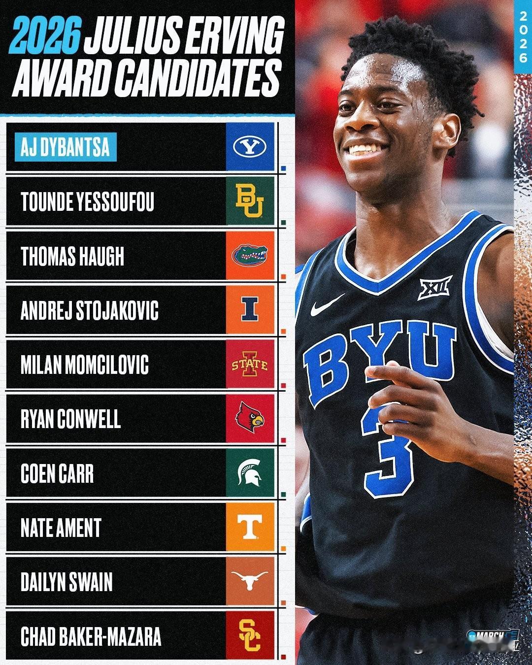 朱利叶斯-欧文奖=年度最佳小前锋季中10人候选名单,三位新生入选,2026年nba选秀 杨百翰AJ Dybantsa,田纳西Nate Ament,贝勒Tounde Yessouf。