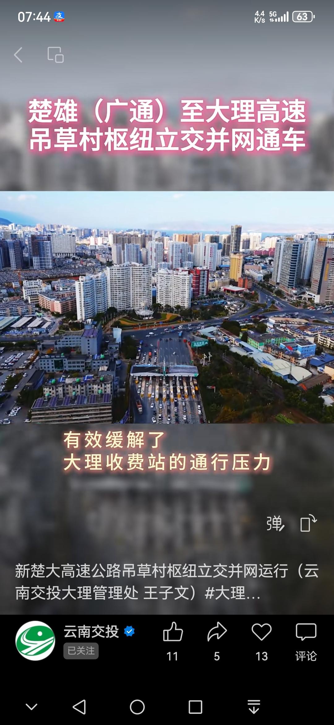 楚雄(广通)至大理高速公路扩容工程项目吊草村枢纽立交正式并网通车运营。 吊草村枢纽立交坐落于下关镇深长村,毗邻大理收费站,整体设计选用双喇叭方案。作为关键控制性工程,自开工起,项目公司便积极联合各参建单位组建攻坚团队,紧盯工程质量与进度节点,克服重重困难,顺利完成匝道主体工程、沥青路面铺设、交安设施安装及机电系统调试等各项任务。 本次开通的9条匝道与2024年3月15日新楚大高速公路吊草村枢纽立交下关支线段(LK0+000至LK1+430)1.430公里衔接后,达成了吊草村枢纽立交与G56楚雄至大理高速公路、G5612大理至巍山至南涧高速公路的互联互通。 同时,其能够有效分流社会车辆,缓解收费站车辆拥堵状况,提升公众出行体验,为推动大理区域经济一体化融合发展提供了有力保障。 互联互