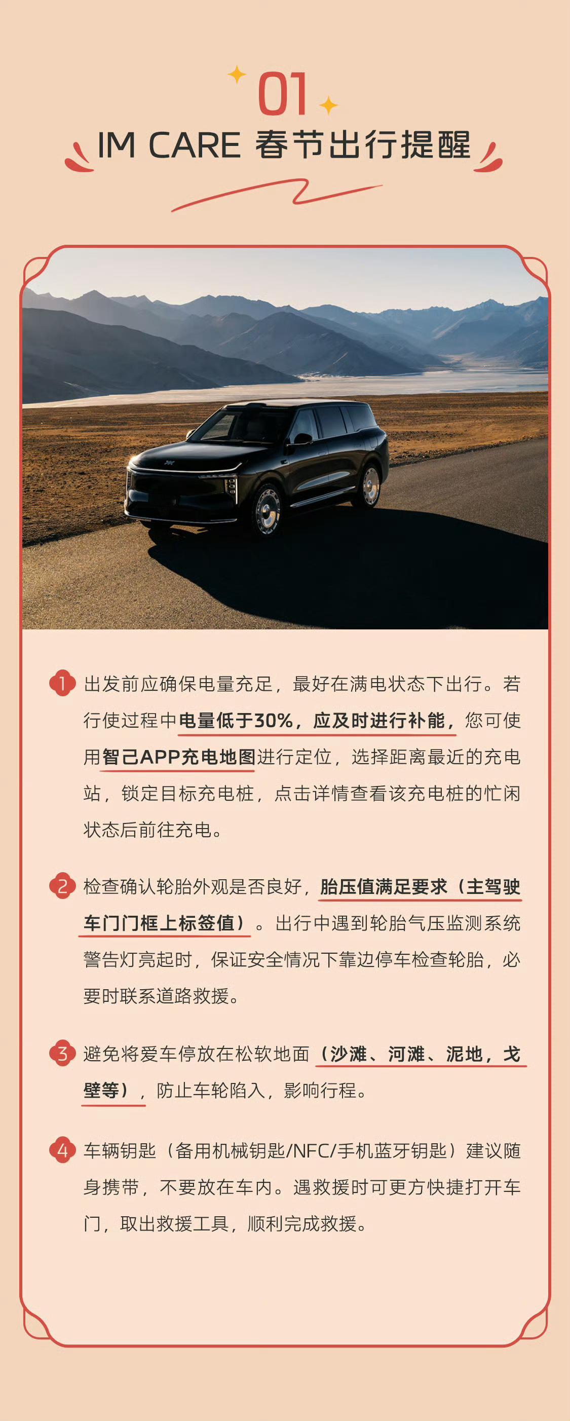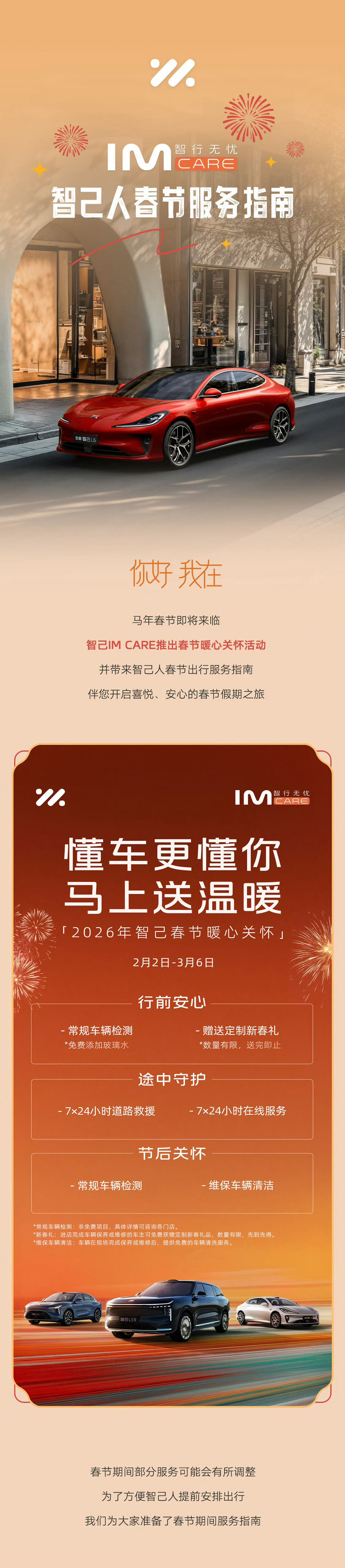 2026年上汽春节暖心关怀活动“你好,我在!”马年春节即将来临🐎智己IMCARE智行无忧 春节暖心关怀活动伴您开启喜悦、安心的春节假期之旅❤️请查收智己人春节出行服务指南👇🏻 懂车更懂你 马上送温暖