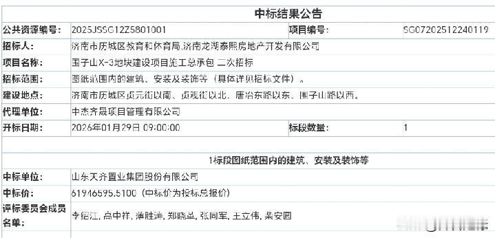 天齐置业连续中标,中标价超4亿 2026年2月4日,济南某公共资源交易平台发布中标结果公告,由山东天齐置业集团股份有限公司中标济南起步区大桥片区26街区YB-R-1地块项目施工总承包工程和围子山X-3地块建设项目施工总承包 二次招标工程,中标价分别为419808145.52元 和61946595.51元。 天齐置业和天元建设集团一样,都是山东建筑行业的龙头企业,天齐置业的总部位于淄博,也拥有建筑工程施工总承包特级资质和多项专业承包一级资质。 天齐置业能够连续中标,与企业实力是分不开的,在当前大环境下,建筑行业困难重重,希望所有建筑企业都能团结一致,早日走出困境。