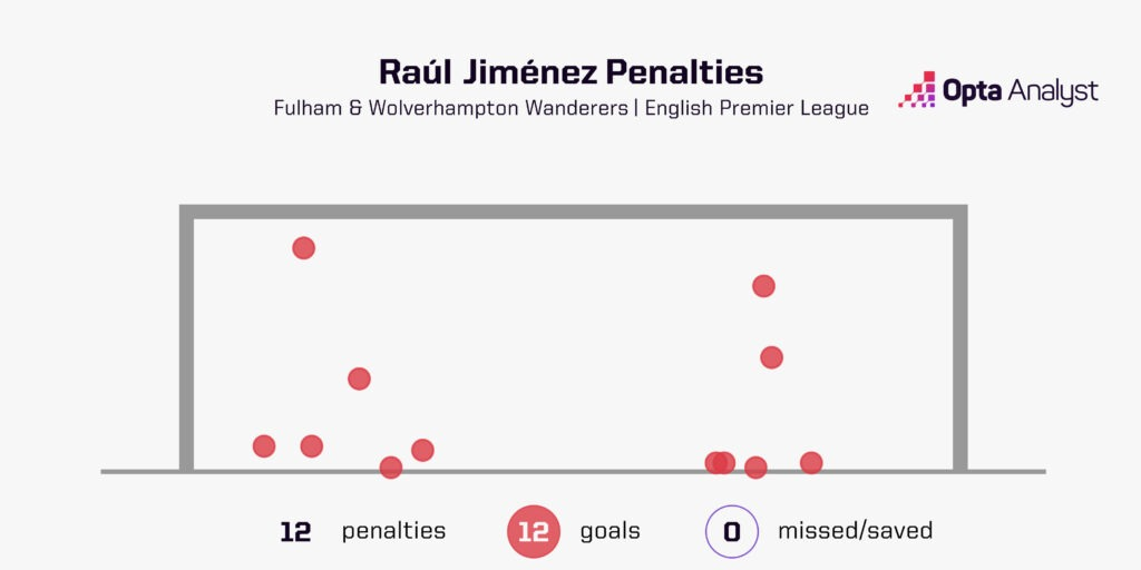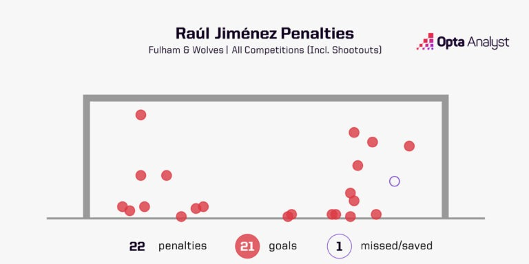 自2018年8月首次代表狼队出战以来,希门尼斯代表俱乐部和国家队共主罚了32粒点球(不包括点球大战)。他只罚丢了两粒(命中率6.3%),而且在这两次扑救中,门将都是在希门尼斯罚完点球后才决定扑救的方向。