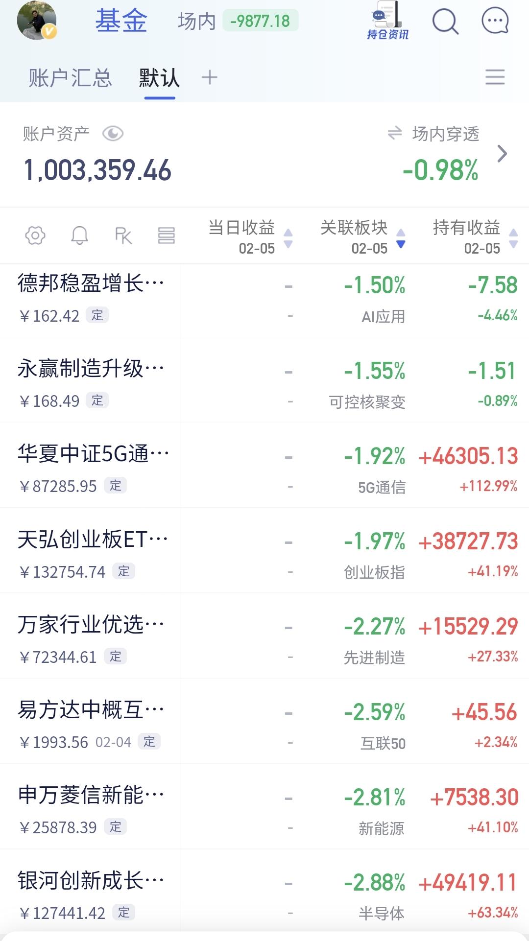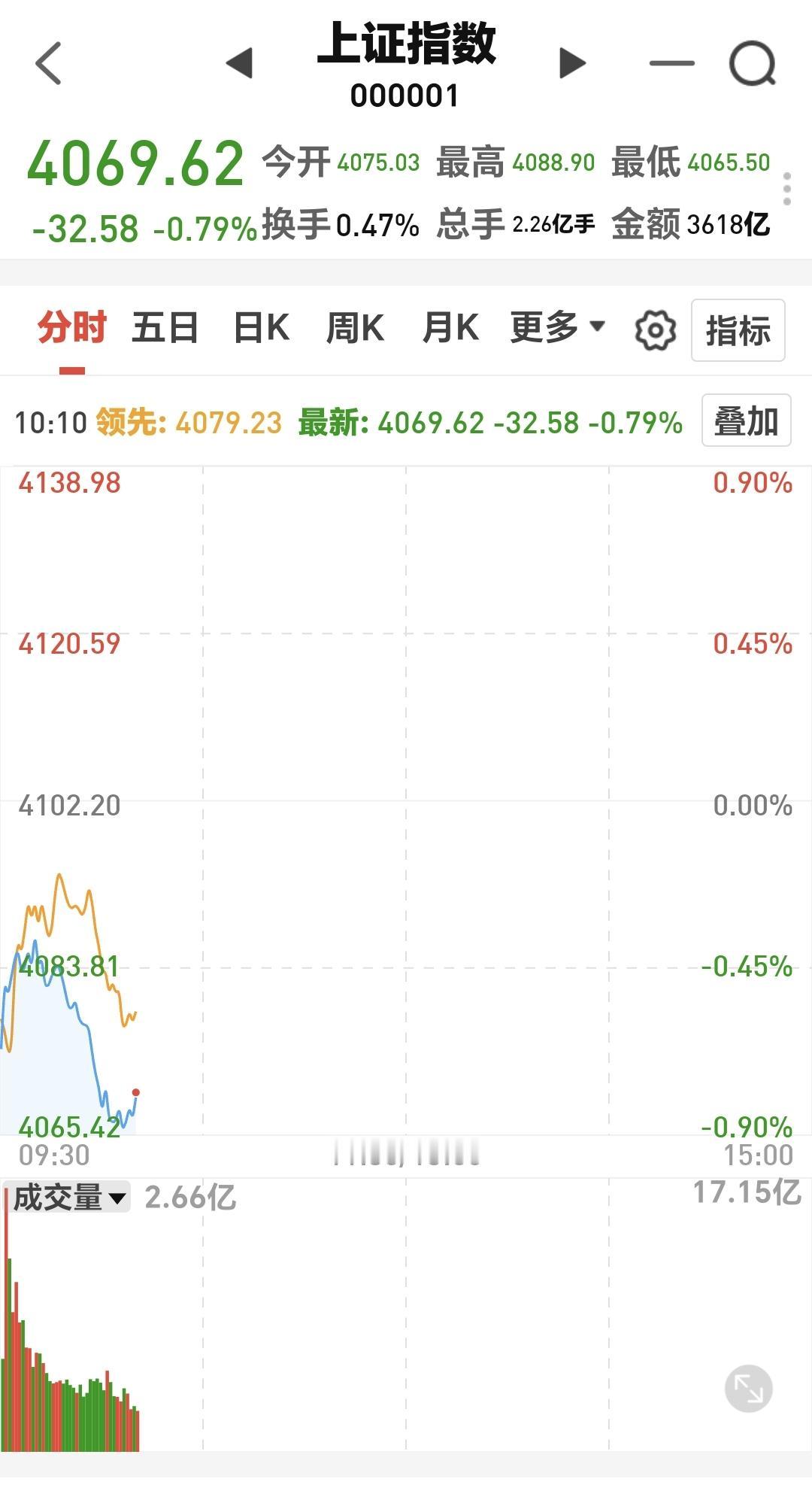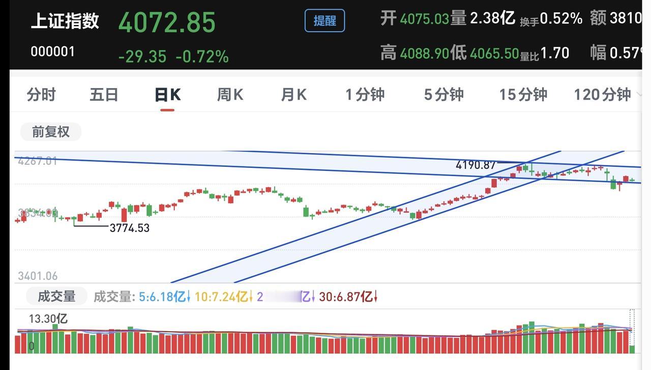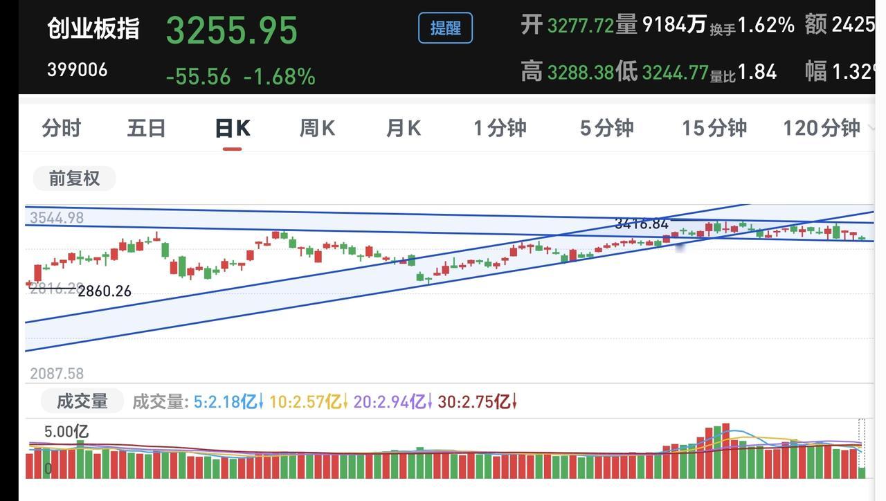 基金:市场指数不能继续下跌 市场开盘以后,三大指数震荡向下,创业板指下跌了1.62%,盘中点位3257点,上证指数下跌了0.81%,盘中点位4068点。 现在盘中五天线位置是4074点,盘中点位4068点,已经跌破了五天线,后面继续观察五天线的得失,如果不能重新站回到五天线之上,震荡调整还会继续。 但盘中也有一个好现象,那就是黄色线还是处于蓝色线上方,两条线之间的敞口还可以,只要能够继续保持这样的敞口,今天下跌的幅度就不会很大,收盘之前缩小下跌幅度是大概率的事情,即使是翻红也是有概率的。 今天盘中最大的问题还是成交量,两市累计成交9553亿,相比于昨天同期数量了14%,说明市场虽然是下跌的,但并没有恐慌盘涌出,也没有资金进场,只要成交量还是这样大幅度萎缩,即使把指数硬拉上去,后面还是会摔下来。 市场上涨1800多家,下跌3500多家,涨停34家,跌停17家,主力资金净流出440亿。 市场现在上涨幅度最大的三个板块是:白酒板块,油气资源板块,消费板块,下跌幅度最大的三个板块是:光伏板块,电网设备板块,黄金板块。 看下面的截图4,这是上证指数日K线图,现在的位置处于日线级别短期下跌通道中,距离下跌通道下轨线比较近,近期观察会不会跌破这个下跌通道的下轨线,如果跌破这个下跌通道的下轨线,会进入加速下跌走势。 看下面的截图5,这是创业板指日K线图,现在的位置也是处于日线级别短期下跌通道中,位置也是距离下跌通道的下轨线比较近,如果近期下跌跌破这个下跌通道的下轨线,也是会走加速下跌的走势。 上证指数和创业板指现在已经到了不能继续下跌的地方,如果继续下跌,会破位下跌通道的下轨线,只要能够保持在这个下跌通道中,就是一个正常的震荡调整,如果跌破这个下跌通道的下轨线,就是一个下跌走势。 持有的基金中,估值上涨的只有白酒板块和大消费板块,下跌幅度最大的三个板块是:半导体板块,新能源汽车板块,先进制造板块,估值整体亏损了9744元。 今天的热门板块还是继续大跌,这让许多人进一步理解为什么不能追涨热门板块,有很多人需要吃过亏以后才能记住这样的教训,但有更多的人即使吃过亏以后他也是记不住的,过一段时间以后他还会重复犯同样的错误。 花一秒钟点赞,花30秒钟评论,就是对我最大的支持,谢谢大家的支持。