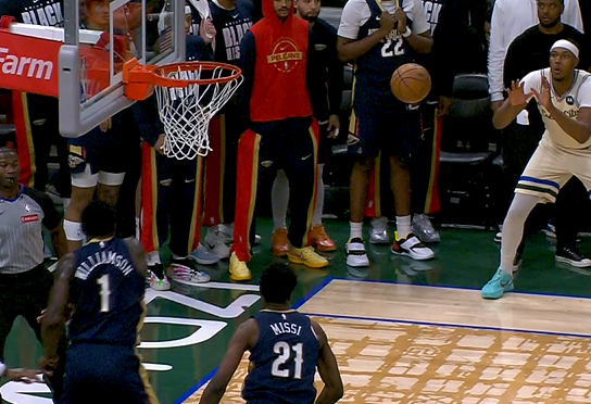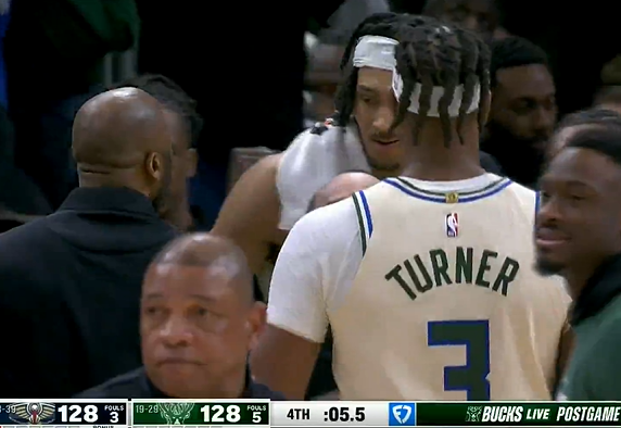 比赛第四节,鹈鹕雄鹿战成128-128,特纳命中关键三分,但裁判回看后判罚特纳踩线违例在先。