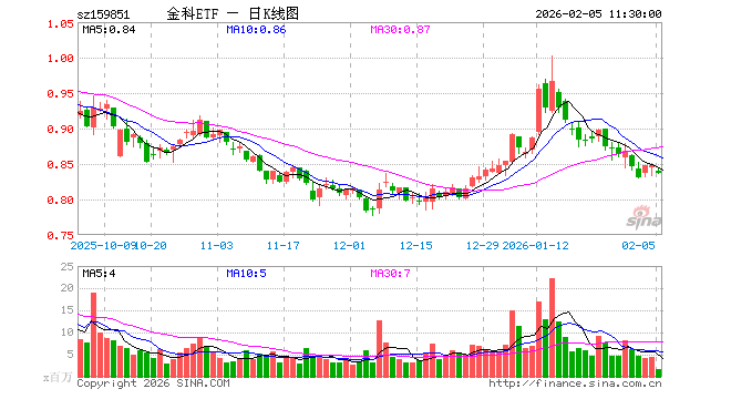 2月5日,截止午间收盘,金融科技ETF(159851)跌1.18%,报0.837元,成交额1.35亿元。金融科技ETF(159851)重仓股方面,同花顺截止午盘跌2.37%,东方财富跌0.52%,指南针跌1.19%,恒生电子跌1.18%,润和软件跌1.51%,新大陆跌1.48%,东华软件跌1.46%,广电运通跌0.93%,银之杰跌0.18%,四方精创涨0.33%。