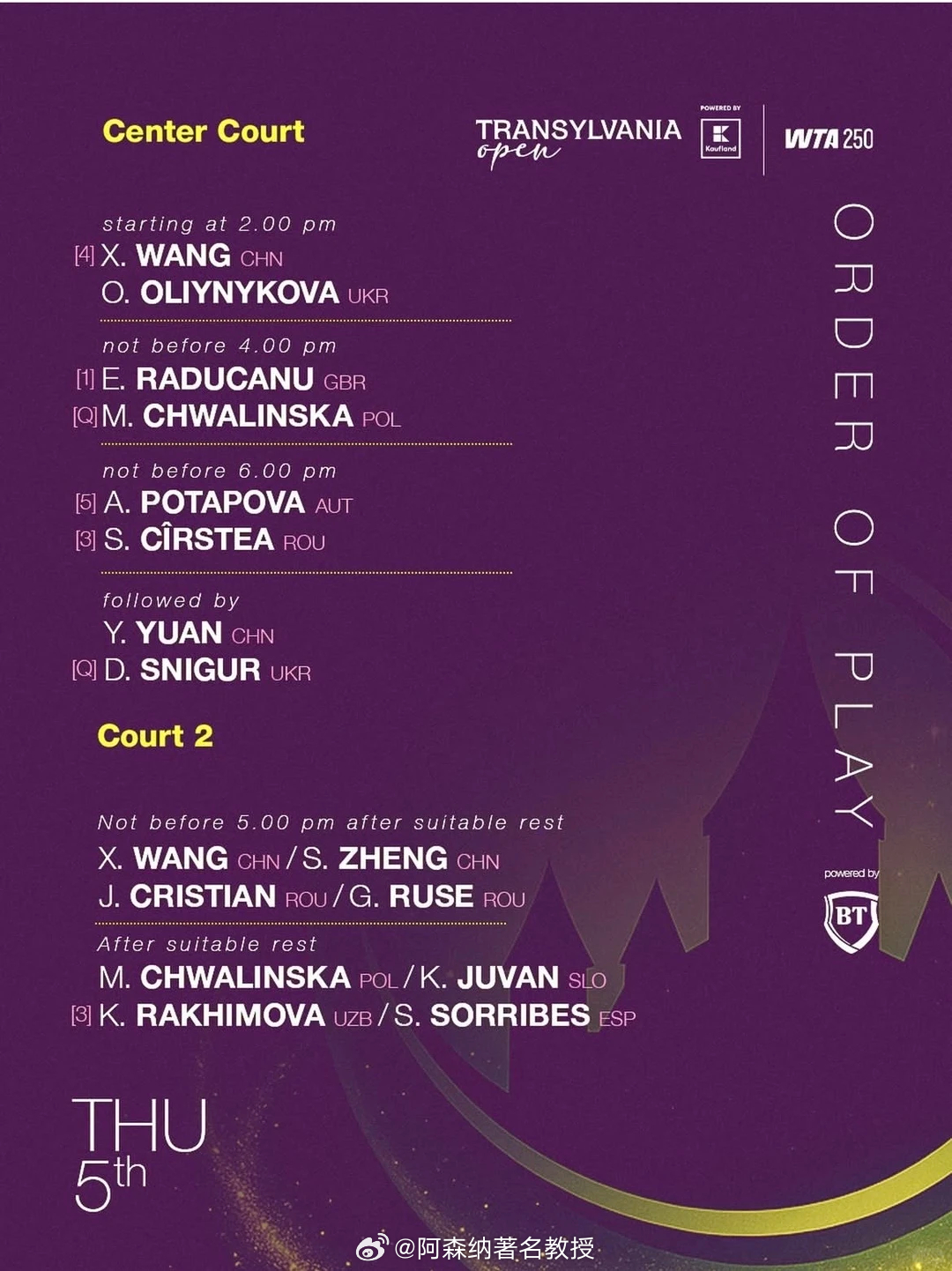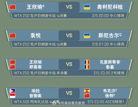 2月5日,WTA250克卢日-纳波卡站,王欣瑜一日双赛:女单四分之一决赛对阵情况:📍中心球场 20:00🇨🇳王欣瑜 ——奥利尼科娃22:30拉杜卡努——赫瓦林斯卡[Q]00:00波塔波娃 ——科斯蒂亚01:30🇨🇳袁悦——斯尼古尔[Q]女双半决赛对阵情况:📍2号球场,女双第二轮:23:00🇨🇳王欣瑜/郑赛赛——克里斯蒂安/鲁塞00:30赫瓦林斯卡/尤万——拉希莫娃/托尔莫 王欣瑜王欣瑜vs奥利尼科娃