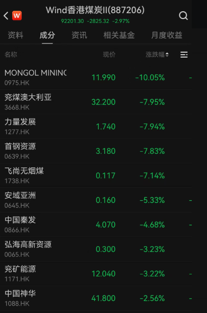 上证报中国证券网讯(记者何漪)2月5日,港股煤炭股普遍走低。截至11点01分,兖煤澳大利亚跌7.95%,首钢资源跌7.83%,力量发展跌7.94%。
