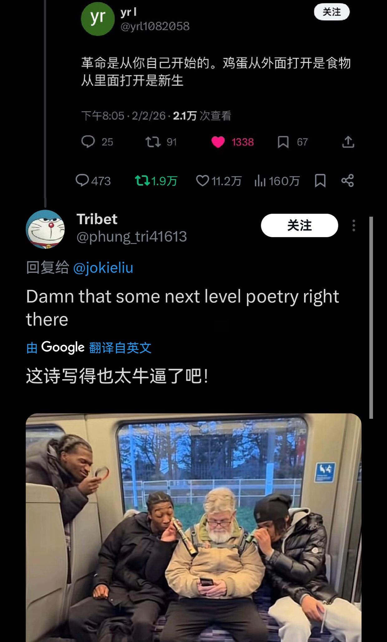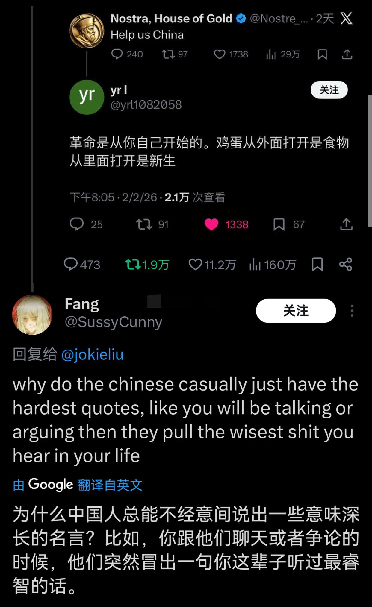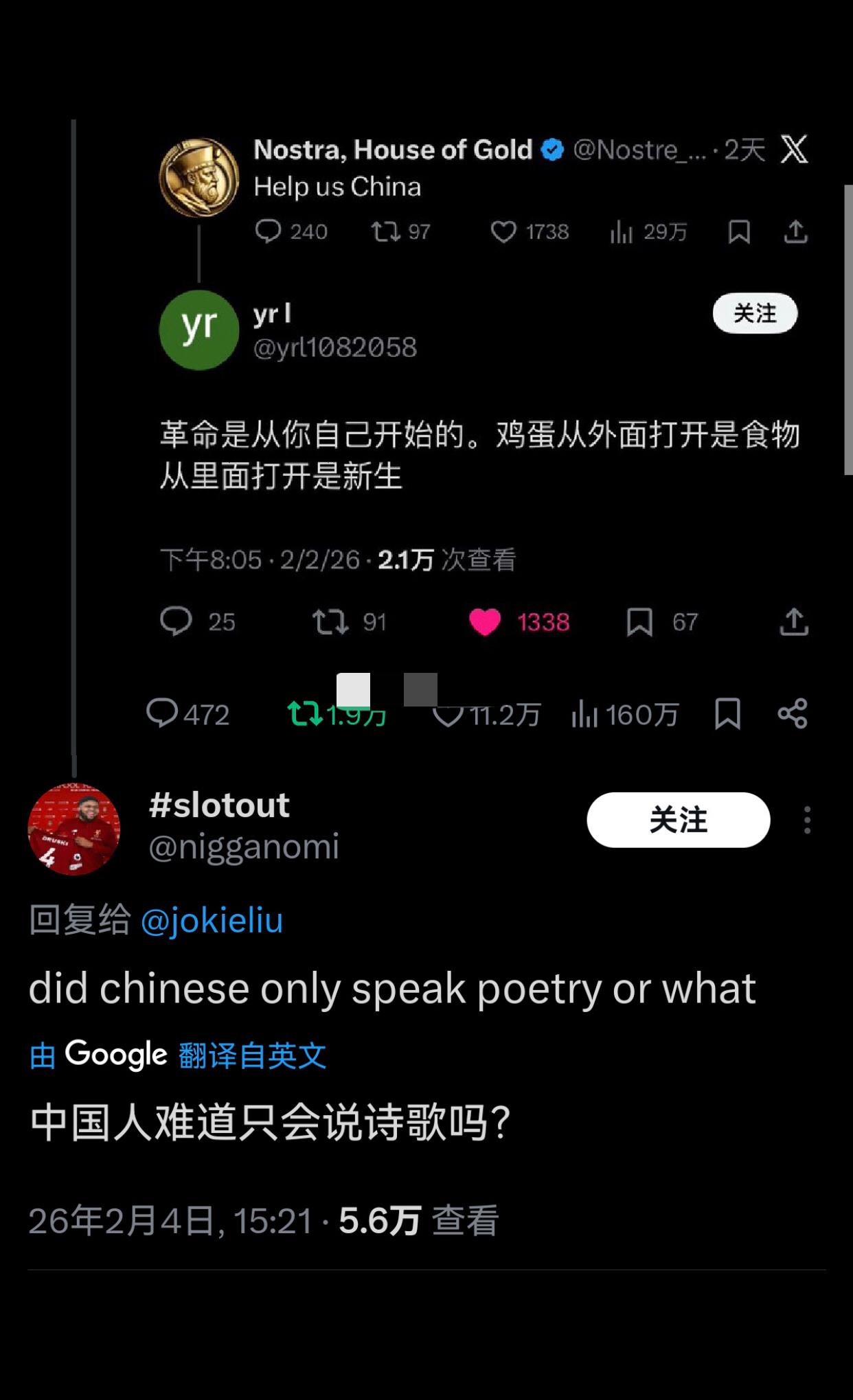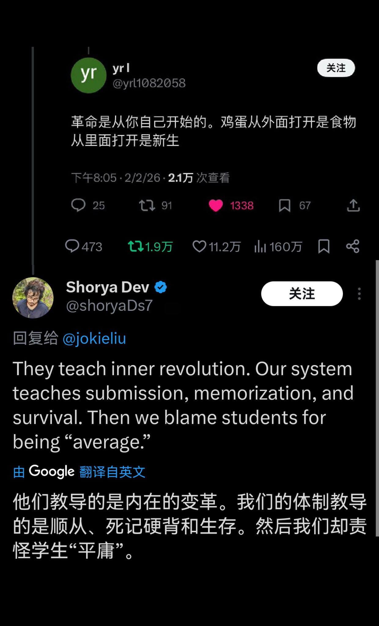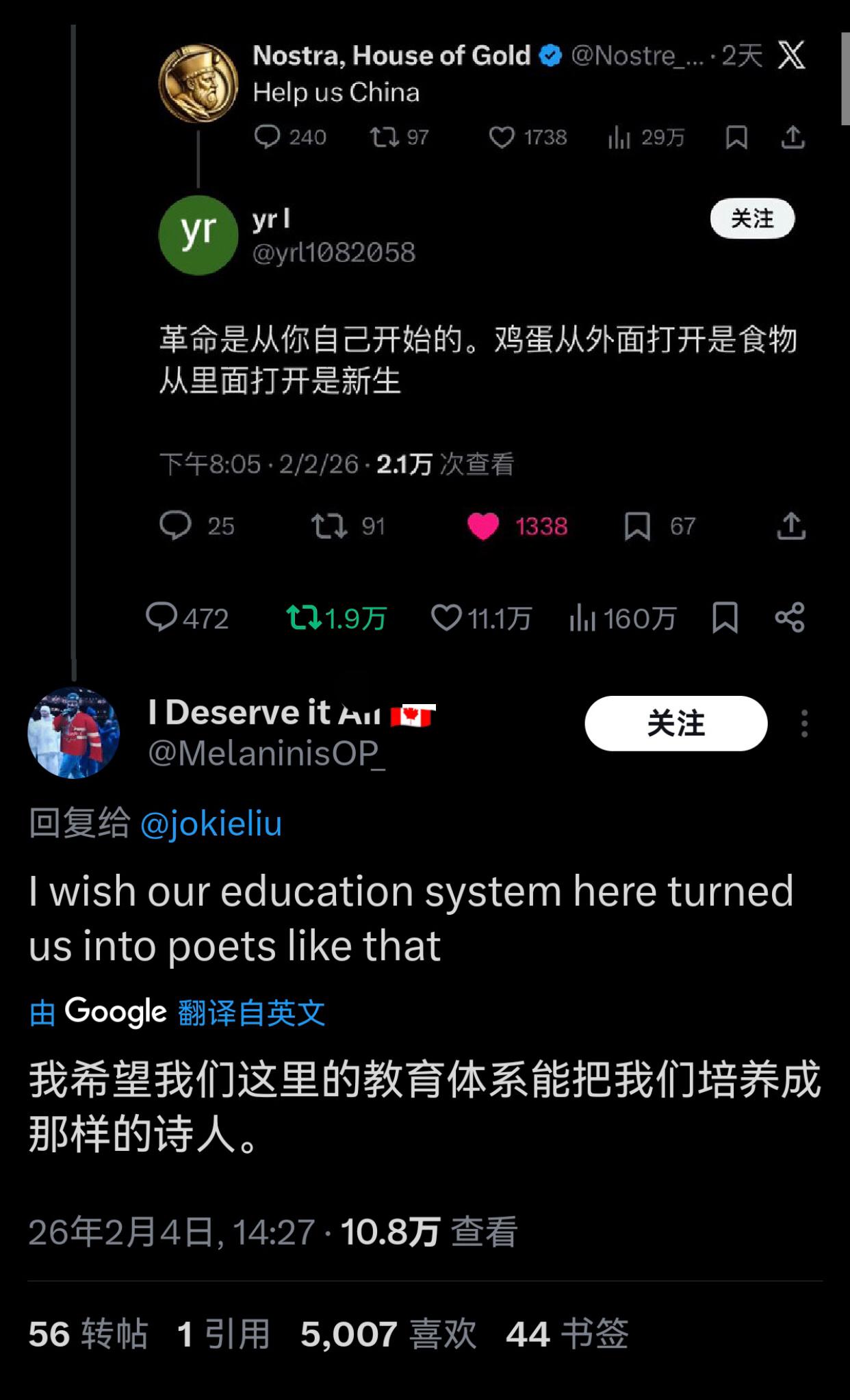 美国网友发文求助中国帮帮他们。 有中国网友留言道:“革命是从你自己开始的,鸡蛋从外面打开是食物,从里面打开是新生。” 美国网友则回应道:“他们教导的是内在变革,我们的体制教导的是‘顺从’、死记硬背和生存,然后我们却责怪学生‘平庸’。”