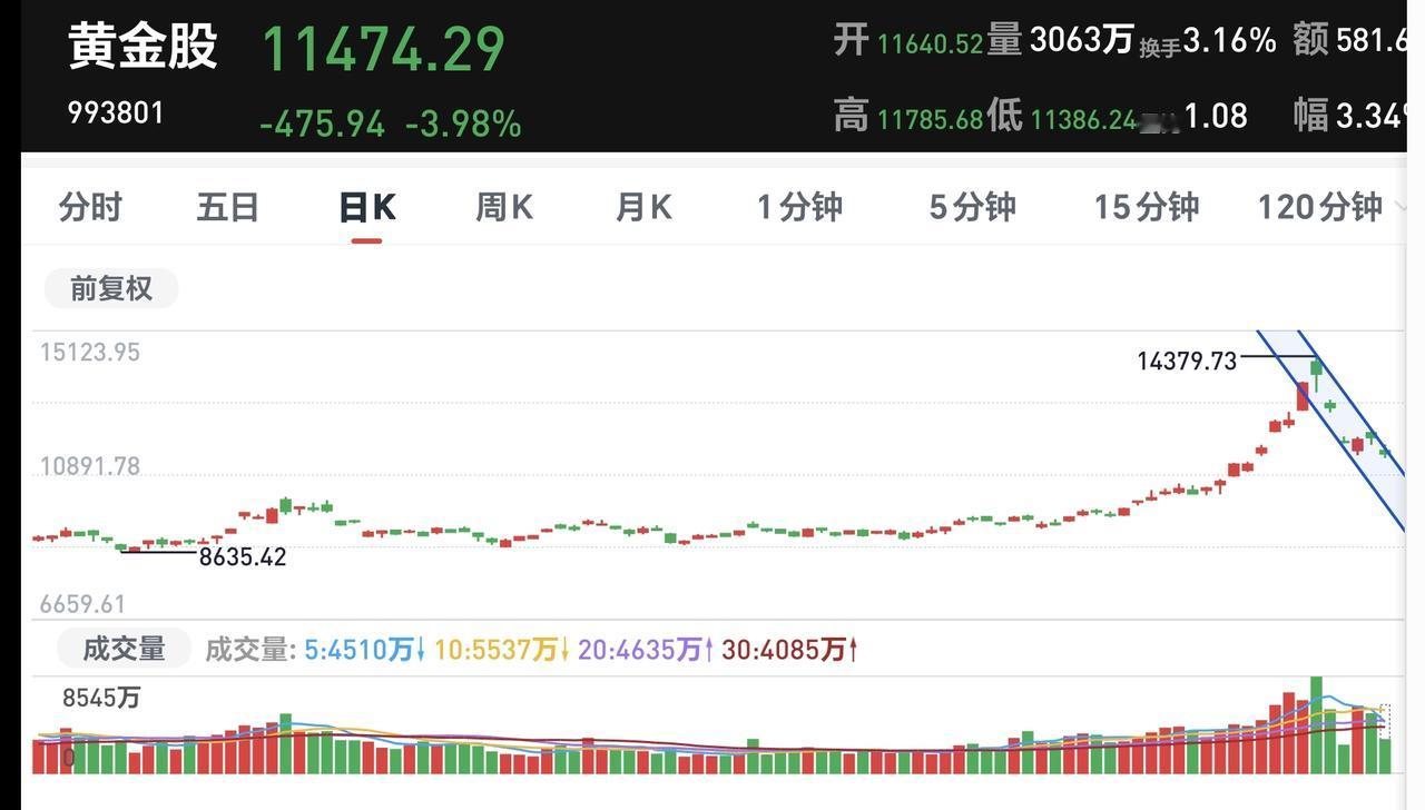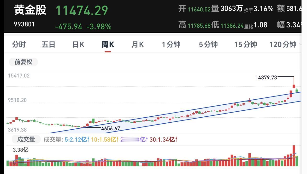基金:黄金板块应该怎么办 市场的走势与主力资金的态度有很大的关系,主力资金想把市场拉上去,市场就能上涨,主力资金想把市场打下来,市场就会下跌,我们能做的只是跟随我们,并不能改变市场走势。 看下面的截图1,这是今天上午主力资金的分时图,指数在震荡的过程当中,主力资金的态度很明确,就是一直在净流出,盘中反弹的时候,主力资金在净流出,盘中下跌的时候,主力资金还是在净流出,只是收盘之前的一个小时,净流出的速度缓慢了一些,今天上午主力资金净流出702亿,超过了昨天上午609亿的净流出额度。 今天上午下跌幅度最大的板块是黄金股板块,估值下跌了5.32%,持有人数在所有板块当中排名第4位,这个板块当中散户的人数比较多。 看下面的截图3,这是黄金股板块日K线图,现在的位置处于日线级别短期下跌通道中,距离下跌通道的上轨线比较近,近期观察能不能上涨突破日线级别下跌通道的上轨线,只有上涨突破了日线级别下跌通道的上轨线,这个板块才有止跌企稳的可能性。 看下面的截图4,这是黄金股板块周K线图,前段时间上涨突破了上涨通道的上轨线,进入了加速上涨走势,最近是在走上涨通道回归的走势,已经来到了上涨通道上轨线附近,但现在还是处于周线级别上涨趋势中,长线持有的人可以继续持有。 加速上涨的板块,很容易走上涨通道回归的走势,原先没有持有这个板块的人不要轻易进场这个板块,因为你没有这个板块的利润垫底,别人能够继续持有,那是他已经挣钱了,可以承受一定的风险,没有持有的人如果进场以后遇到下跌,就是真真实实的亏损,而别人只是利润的回吐,这样会影响你整体的持有心态。 花一秒钟点赞,花30秒钟评论,就是对我最大的支持,谢谢大家的支持。