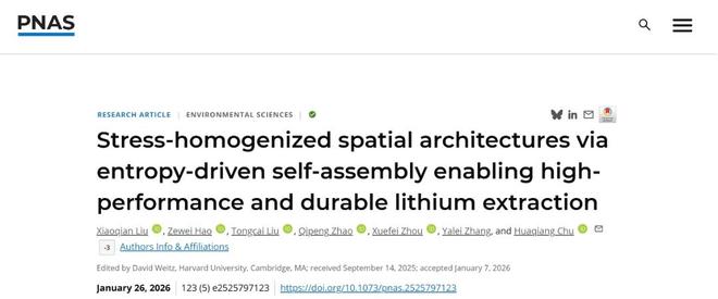 近日,国际权威学术期刊《美国科学院院刊》(proceedingsofthenationalacademyofsciencesoftheunitedstatesofamerica,pnas)在线发表了同济大学环境科学与工程学院张亚雷教授、褚华强教授团队的这一最新研究成果,论文题为“stress-homogenizedspatialarchitecturesviaentropy-drivenself-assemblyenablinghigh-performanceanddurablelithiumextraction”(熵驱动自组装构筑应力均质化架构,实现高效持久锂提取)。