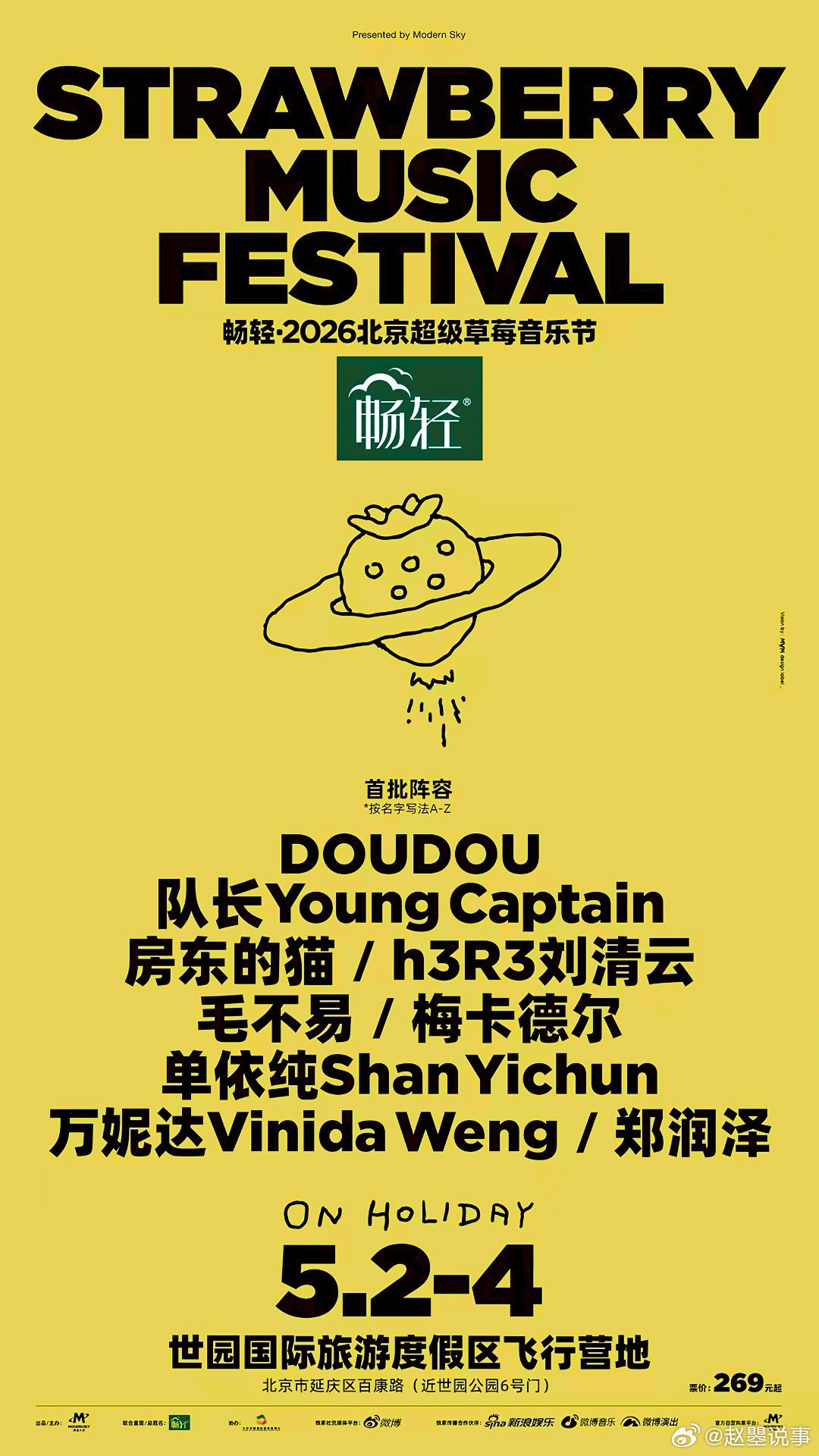 北京草莓音乐节首批阵容 这阵容直接夯爆了🔥DOUDOU、队长Young Captain、房东的猫、h3R3刘清云、毛不易、梅卡德尔、单依纯、万妮达、郑润泽齐聚,民谣、流行、摇滚、说唱全覆盖,五一音乐狂欢预定,坐等开唱嗨翻全场!