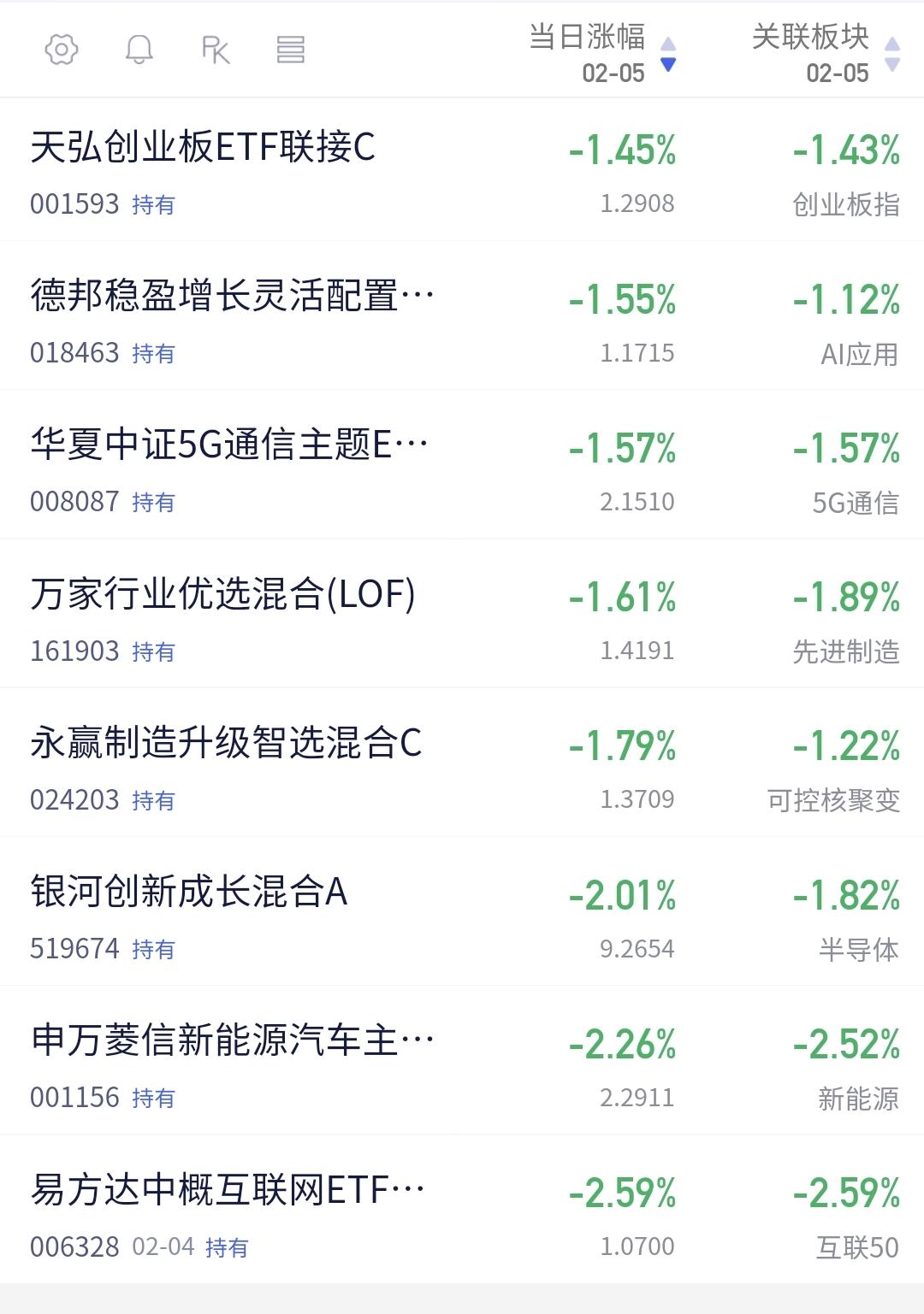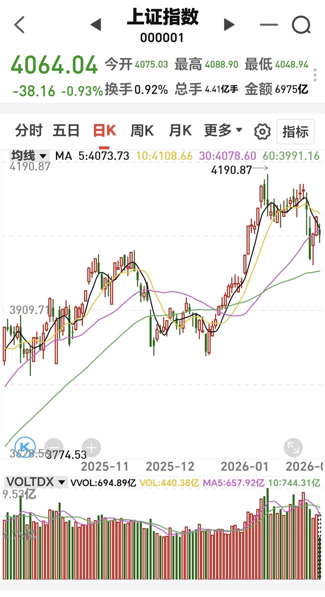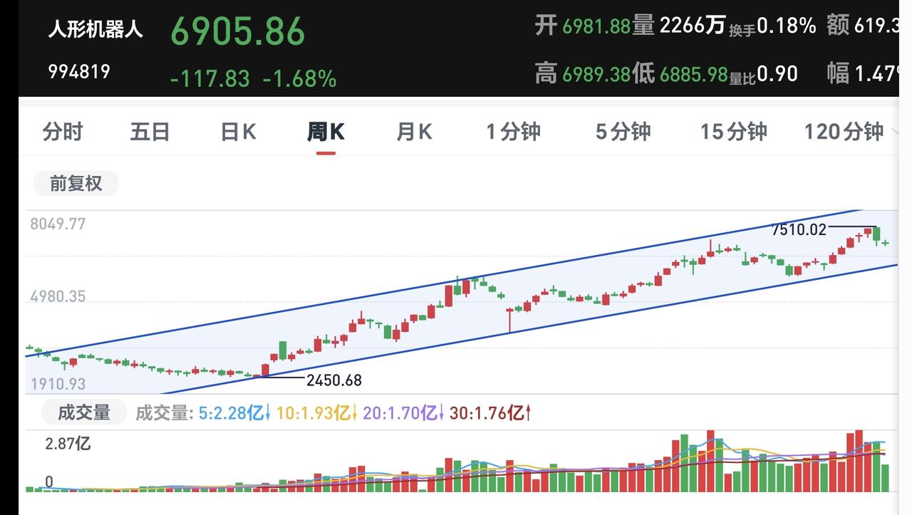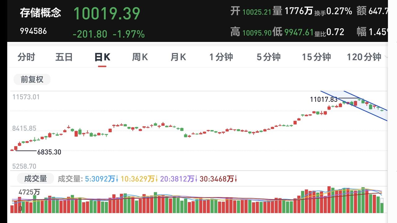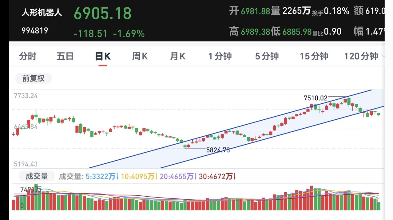基金:指数盘中反弹,震荡调整有没有结束 市场指数下午开盘以后小幅度震荡向上,现在三大指数的下跌幅度都已经缩小,创业板指下跌了1.76%,盘中点位3253点,上证指数上下跌了0.87%,盘中点位4066点。 现在黄色线已经与蓝色线纠缠在一起,后面要重点观察这两条线的位置变化,看看黄色线能不能再次向上拉开与蓝色线的距离,如果黄色线下穿蓝色线,那就是在硬拉指数,这样的上涨是不稳当的。 现在五天线位置是4073点,盘中点位4066点,还是在五天线之下,还是没有能够站上五天线,今天收盘之前重点观察能不能站上五天线,能不能收在五天线之上,只有站上五天线,市场才有转好向上的可能性。 两市累计成交16382亿,相比于昨天同期缩量了13%,这说明在刚才的小幅度反弹过程当中是在继续缩量,没有资金愿意进场,这样的上涨持续性不强,强拉硬拽的上涨并不是真实的上涨。 市场上涨1500多家,下跌3800多家,涨停48家,跌停23家,主力资金净流出769亿。 机器人板块现在盘中估值下跌了1.87%,也是连续第二个交易日下跌,持有人数在所有板块当中排名第六位。 看下面的截图6,这是机器人板块日K线图,前段时间下跌跌破了上涨通道的下轨线,现在是处于有效破位当中,想进场的人需要耐心等待。 看下面的截图7,这是机器人板块周k线图,现在的位置处于上涨通道当中,机器人板块处于周线级别上涨趋势中,长线持有的人可以继续持有。 存储芯片板块今天也是下跌,现在盘中估值下跌了2.80%,也是连续第二个交易日下跌,这个板块的持有人数在所有板块当中排名第七位。 看下面的截图8,这是存储概念板块日K线图,现在的位置处于日线级别短期下跌通道中,近期观察是上涨突破下跌通道的上轨线,还是继续在这个下跌通道中运行,想进场的人需要耐心等待上涨突破这个下跌通道上轨线,才可以考虑要不要进场。 看下面的截图9,这是存储概念周K线图,前段时间上涨突破了上涨通道的上轨线,现在也是在走上涨通道回归的走势,但还是处于周线级别上涨趋势中,长线持有的人可以继续持。 持有的基金中,估值上涨幅度最大的三个板块是:大消费板块,白酒板块,创新药板块,下跌幅度最大的三个板块是:新能源汽车板块,半导体板块,可控核聚变板块,估值整体亏损了4906元。 现在指数在进一步继续缩小下跌幅度,成交量还在继续萎缩当中,只是这一阶段并没有大幅度净流出,对于这样的上涨,不要抱有太大的希望,市场的震荡调整还没有结束,只有主力资金大幅度进场的时候,才是调整结束的时候。 今天究竟应该怎么办?我会在评论区留言。 花一秒钟点赞,花30秒钟评论,就是对我最大的支持,谢谢大家的支持。