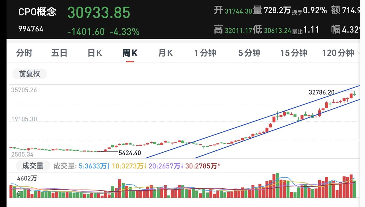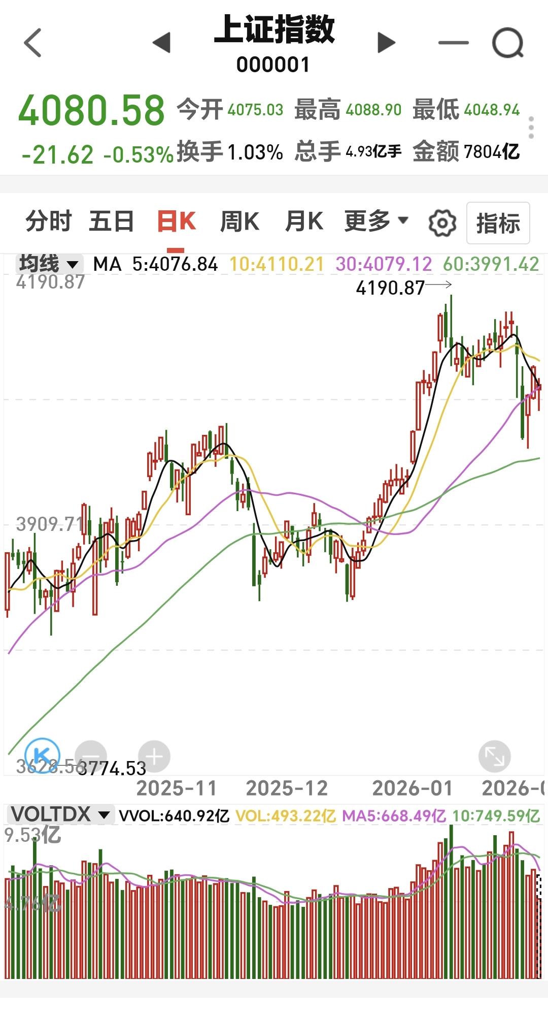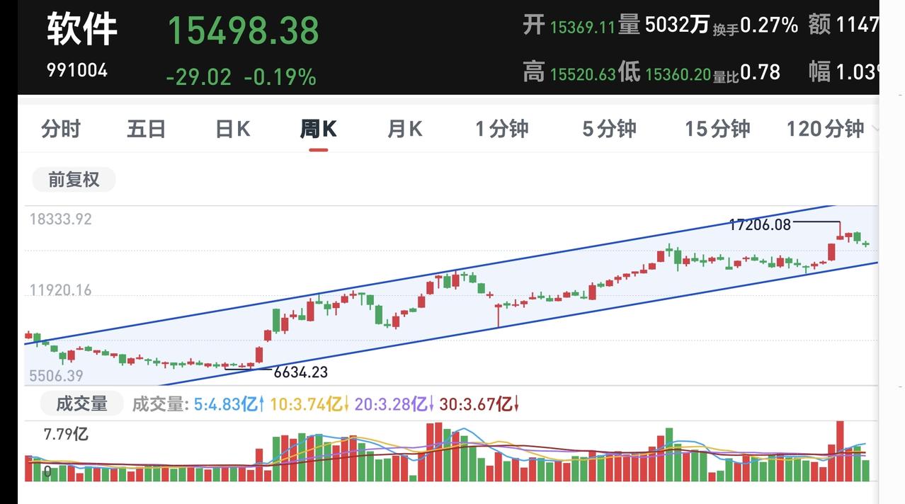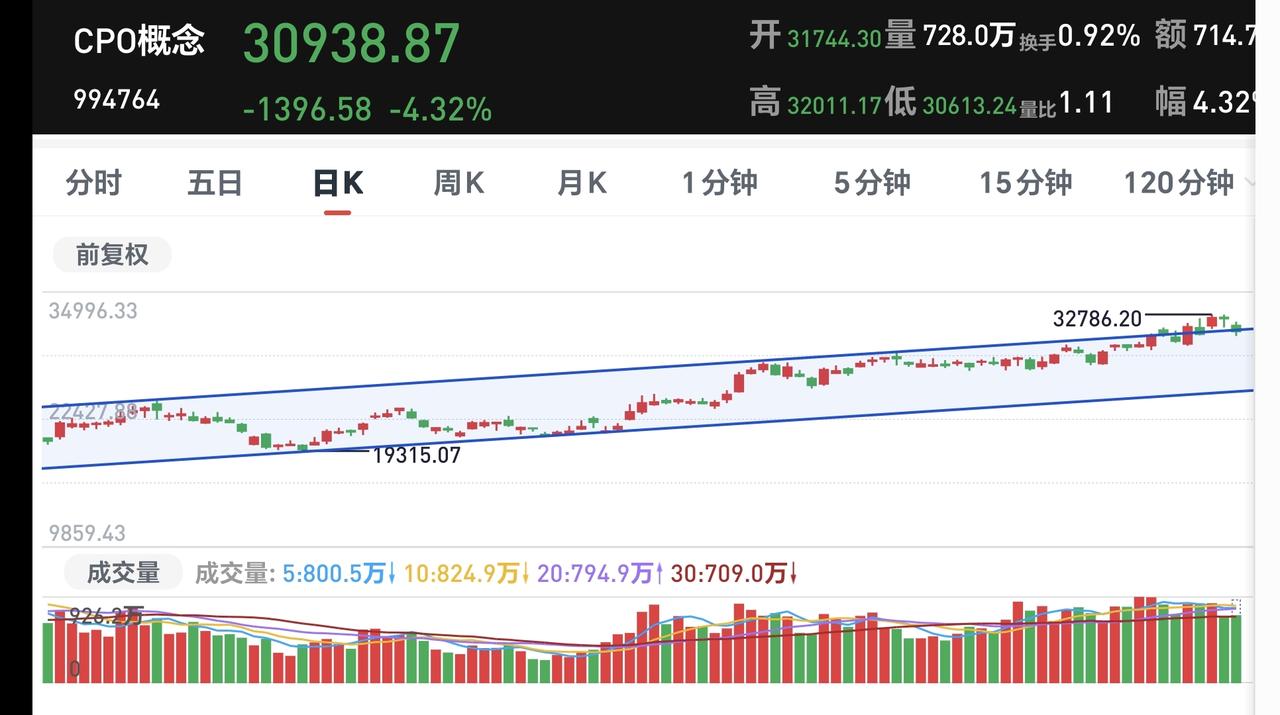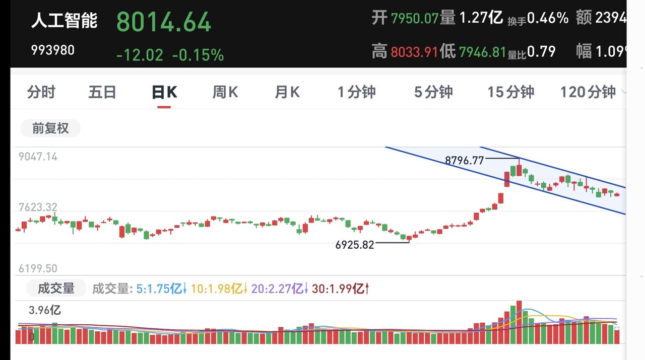 基金:究竟有没有春节红包行情 三大指数全部是探底回升,现在的下跌幅度大幅度缩小,创业板指下跌了1.24%,盘中点位3270点,上证指数下跌了0.58%,盘中点位3278点。 黄色线与蓝色线纠缠在一起,这样的情况下,很难判断收盘之前的涨跌,现在是勉强站在五天线之上,但并不能表明已经站稳,能不能收在五天线之上才是最重要的。 两市累计成交17947亿,相比于昨天同期缩量了11%,1800多家上涨,3400多家下跌,下跌家数超过了上涨家数,涨停51家,跌停24家,跌停家数超过了20家,主力资金净流出778亿。 看下面的截图5,这是AI应用板块日K线图,现在的位置处于这个下跌通道中,想进场的人需要耐心等待上涨突破下跌通道的上轨线,才可以考虑要不要进场。 看下面的截图6,这是AI应用板块周K线图,连续几周的下跌,但没有跌破上涨通道的下轨线,AI应用板块周线级别还是处于上涨趋势中,长线持有的人可以继续持有。 看下面的截图7,这是人工智能板块日K线图,现在的位置处于日线级别短期下跌通道中,既没有上涨突破下跌通道的上轨线,也没有下跌跌破下跌通道的下轨线。想进场的人也是需要耐心等待,只有突破了下跌通道的上轨线,才可以考虑要不要进场。 看下面的截图8,这是人工智能板块周K线图,现在的位置处于上涨通道中,人工智能板块周线级别处于上涨趋势中,长线持有的人可以继续持有。 看下面的截图9,这是cpo板块日K线图,今天的下跌又回到了上涨通道内,这也是上涨通道回归的走势,现在日线级别还是处于上涨趋势中,短线持有的人可以继续持有。 看下面的截图10,这是CPO板块周K线图,今天的大跌并没有跌破这个上涨通道的下轨线,cpo板块周线级别还是处于上涨趋势中,长线持有的人可以继续持有。 今天最大的问题还是成交量的问题,还是资金不愿意进场的问题,这是成交量连续第四天萎缩,这样的情况之下,还没有看到春节红包行情的可能性,什么时候看到资金大幅度进场,那个时候再观察有没有春节红包行情。 今天究竟应该怎么办?我会在评论区留言。 花一秒钟点赞,花30秒钟评论,就是对我最大的支持,谢谢大家的支持。