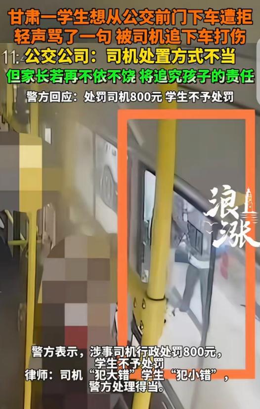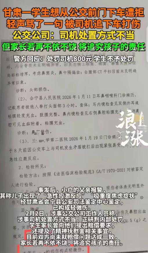 甘肃,一16岁男孩坐公交车,他想从前门下车,司机不让,男孩轻声骂了一句,被司机追下车打了一顿,男孩父亲愤怒报警,说儿子出现“急性应激反应”患上重度焦虑症,构成轻微伤,要求司机赔钱,并支付精神抚慰金。不料,公交公司回应:司机不对,但家长如果再不依不饶,将追究孩子的责任。 在甘肃会宁县发生了一起公交冲突事件,事情的起因本应是一个小小的争执,但却最终演变成了肢体冲突、医疗、赔偿和对峙,甚至牵涉到警方的处罚和企业的回应。 事件发生在1月11日中午,16岁的男孩小户放学后乘坐了9路公交车,车到站后,小户走到前门准备下车。 按照公交的规定,通常是前门上车、后门下车,但司机当时要求他去后门下车,小户当时心里不太高兴,转身向后门走时,轻声骂了司机一句。 这一句看似无关紧要的吐槽,激怒了司机,当车停稳后,司机罗某某直接下车并锁住车门,追了上去,将小户按在车外并对他进行殴打。 周围的乘客和路人试图干预,但因为局势太突然,男孩的头部和面部还是受到了重创,事后检查显示他鼻部有挫伤,双耳道黏膜充血。 得知此事后,小户的父亲立刻报警并要求对伤情进行鉴定,司法鉴定结果显示,男孩受伤较轻,属于轻微伤,而更严重的是,小户因为这次事件出现了急性应激反应,最终被诊断为重度焦虑,甚至不敢再坐公交车,情绪和睡眠都受到了影响。 小户的父亲认为,司机的暴力行为性质恶劣,要求公交公司赔偿孩子的医疗费、检查费等损失,并要求支付精神抚慰金,以安抚孩子的心理创伤。 警方随后对司机进行了调查,依据治安管理处罚法,对司机作出了800元罚款的行政处罚,考虑到小户是未成年人且事件情节较轻,警方决定不对男孩进行处罚。 按理说,在处罚决定后,赔偿问题应该可以顺利协商解决,但公交公司的一番回应却让事情变得更加复杂。 公司承认司机的处理方式不当,违反了公司的规定,表示将会对司机进行内部处罚,但令人意外的是,公交公司在谈到赔偿时提到,如果家长继续在赔偿问题上纠缠,他们也会追究男孩辱骂司机的责任。 这句话让小户的父亲感到愤怒,他认为既然警方已经定了责,明确司机打人是违法行为,那么虽然孩子骂人不对,但绝不能因此成为被打的理由。 而公交公司在承认司机错误的同时,反而用追责的方式来施压,这让家长感到十分不公,也让许多网友觉得公司并没有表现出应有的解决问题的态度。 律师对此事也发表了看法,认为小户骂人虽然是不文明行为,但司机追打未成年人致使其受伤,已经触犯了治安管理相关规定,警方对司机的处罚是合适的。 而在民事赔偿方面,司机需要承担孩子的医疗费、护理费等实际费用,如果有明确的心理创伤诊断,精神抚慰金也可以依法要求。 至于公交公司提出要追究孩子的责任,律师指出,即使孩子有不当行为,这也不能消除司机的违法责任,更不能作为讨价还价的筹码。 这起事件的关键,最终还是双方都未能冷静处理情绪,司机在维护规则方面并无错,但以暴力方式解决纠纷显然是越了线,而孩子未按规定下车且骂人,也显示了他缺乏礼貌。 作为服务行业的公交公司,应该理智地处理纠纷,而不是用暴力解决问题,而公司更应该主动承担起管理责任,平和地处理赔偿问题,而不是威胁未成年人的家长。 目前,双方关于赔偿的问题尚未达成一致,事件仍在进一步沟通中,这起本应小事化了的冲突,提醒我们在公共场合要遵守规则、讲文明,遇到矛盾要冷静处理,不要让一时的冲动把小摩擦变成无法挽回的大纠纷,最终不仅伤害了他人,也给自己带来了法律和经济上的麻烦。 对此你怎么看? 信源:长江云新闻